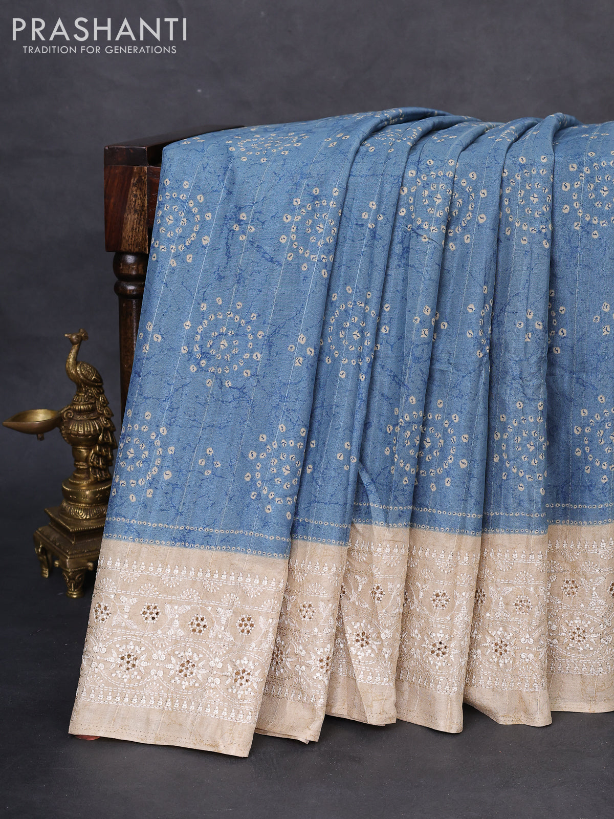 Semi tussar saree pastel blue and beige with allover bandhani prints and embroidery cut work border