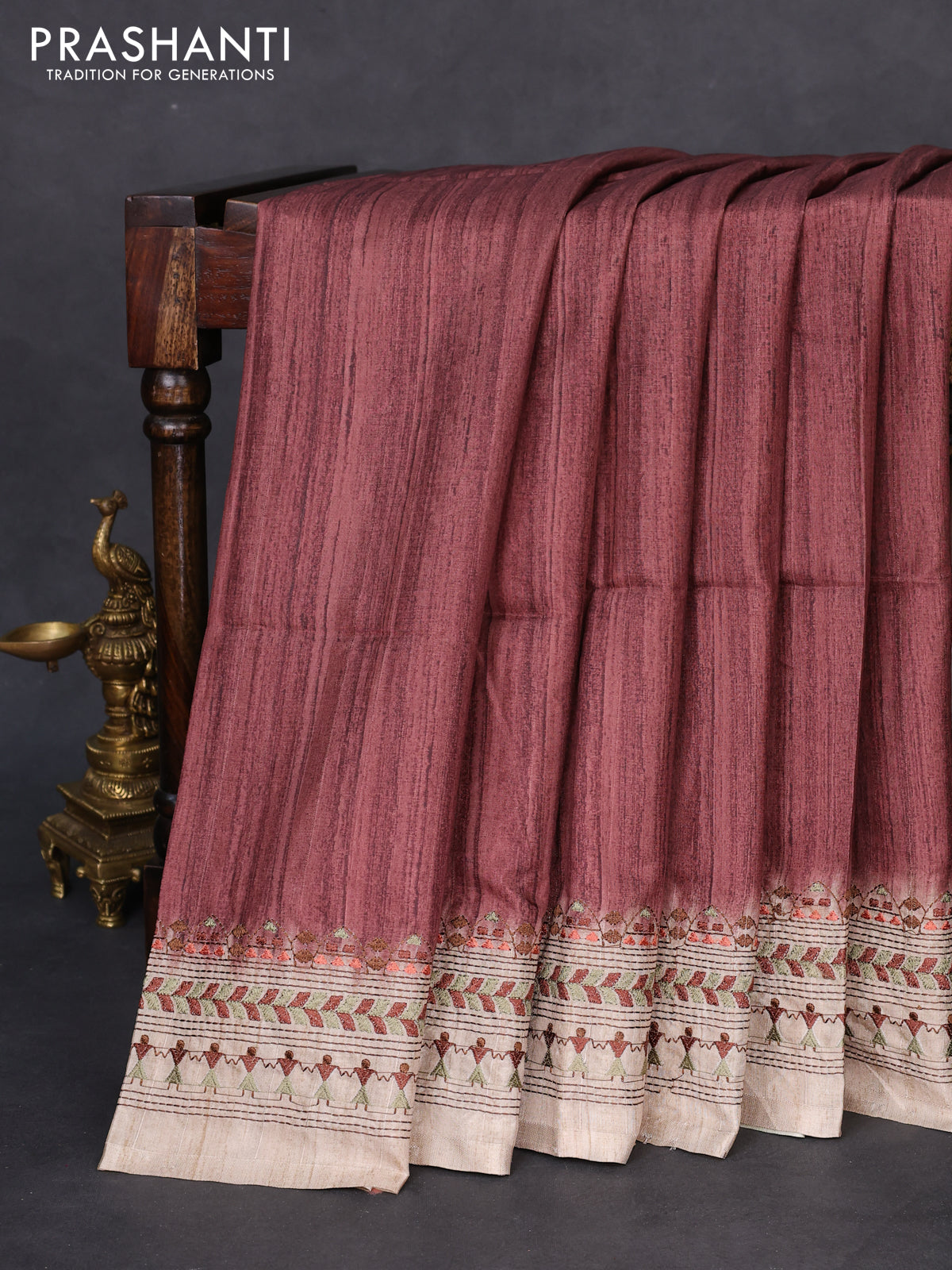 Semi tussar saree pastel brown and beige with plain body and embroidery pallu & border