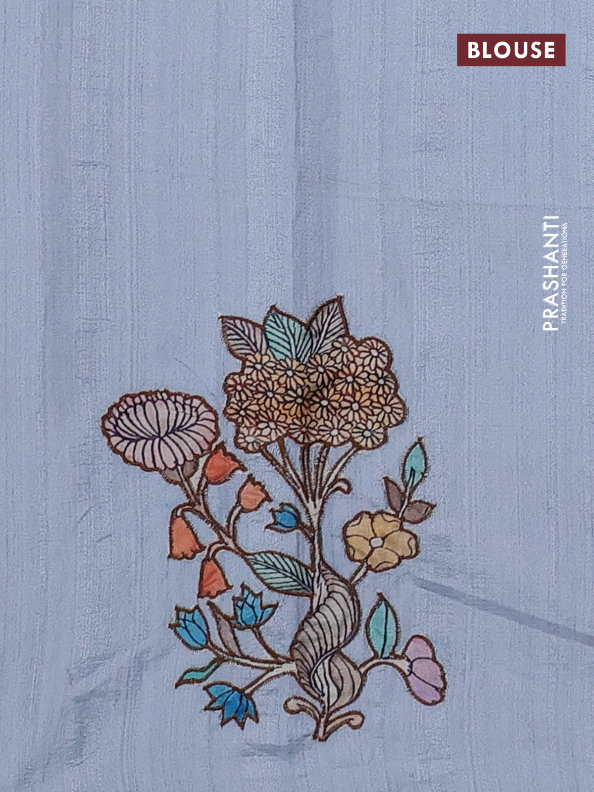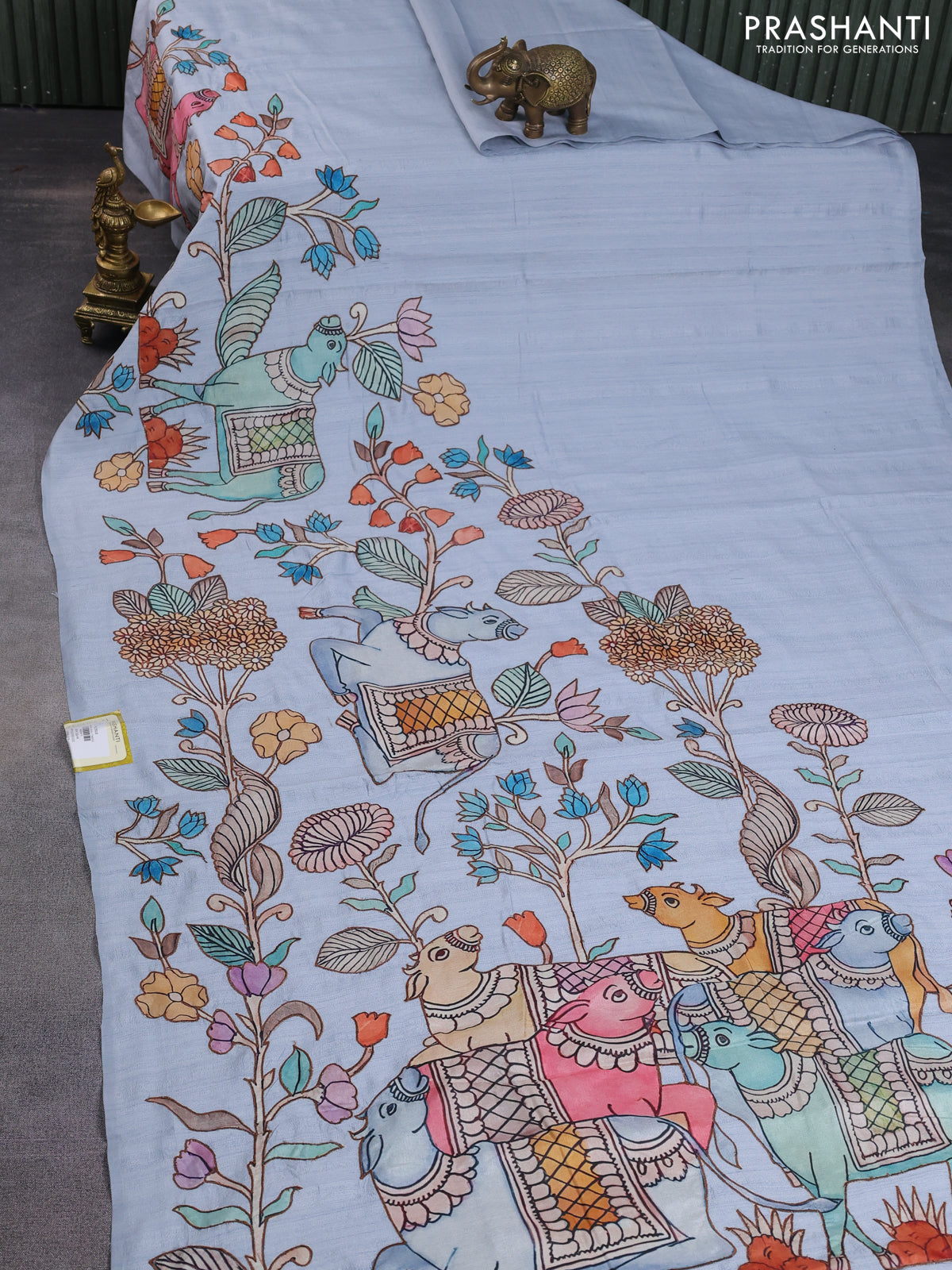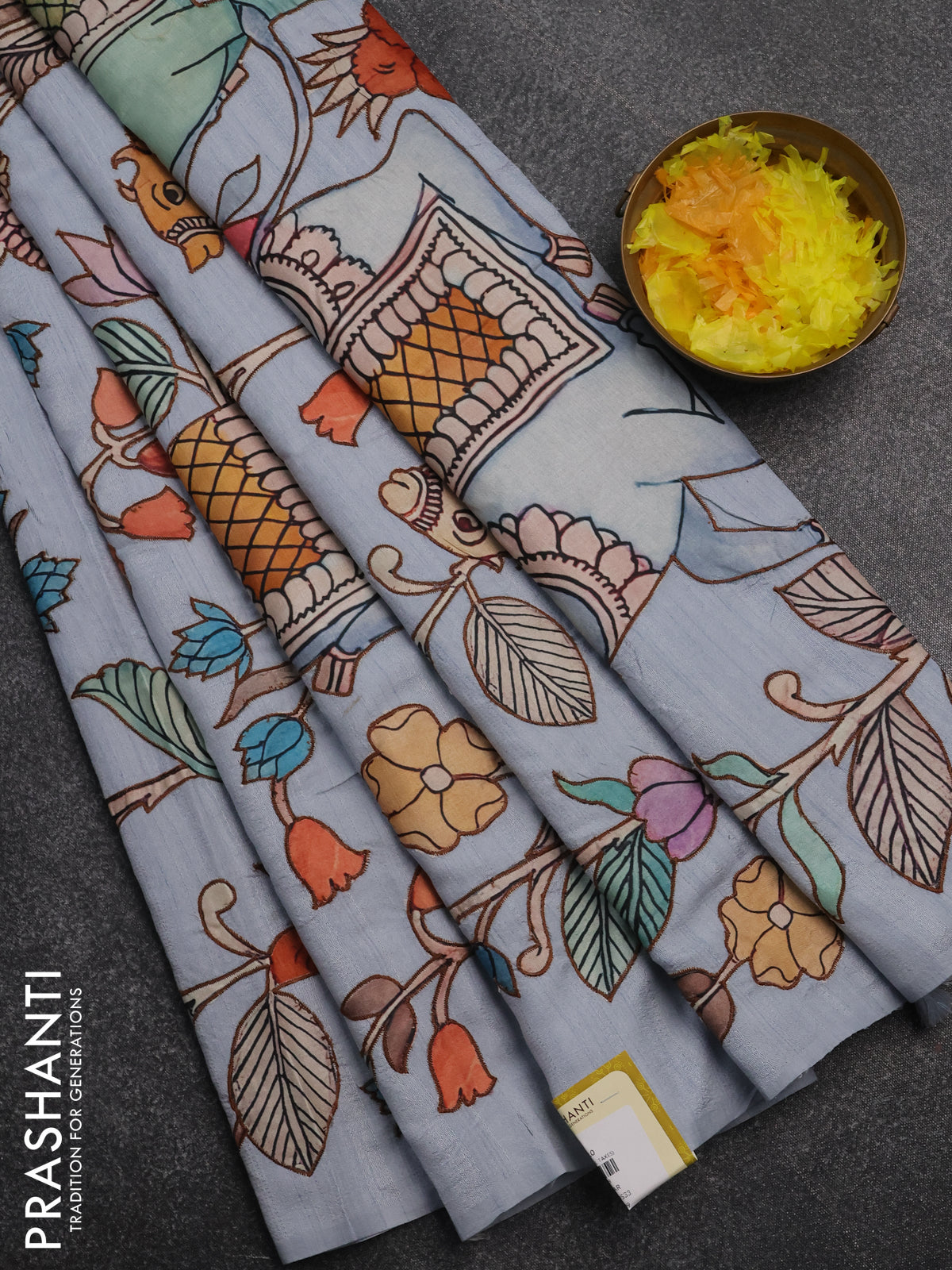 Semi tussar saree pastel grey with kalamkari applique work in borderless style