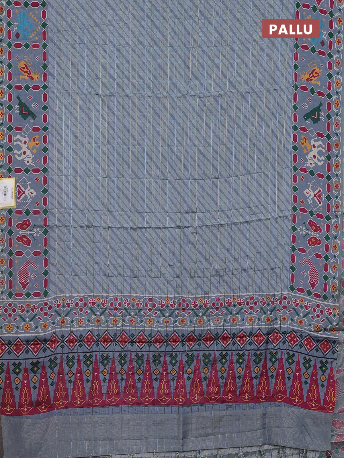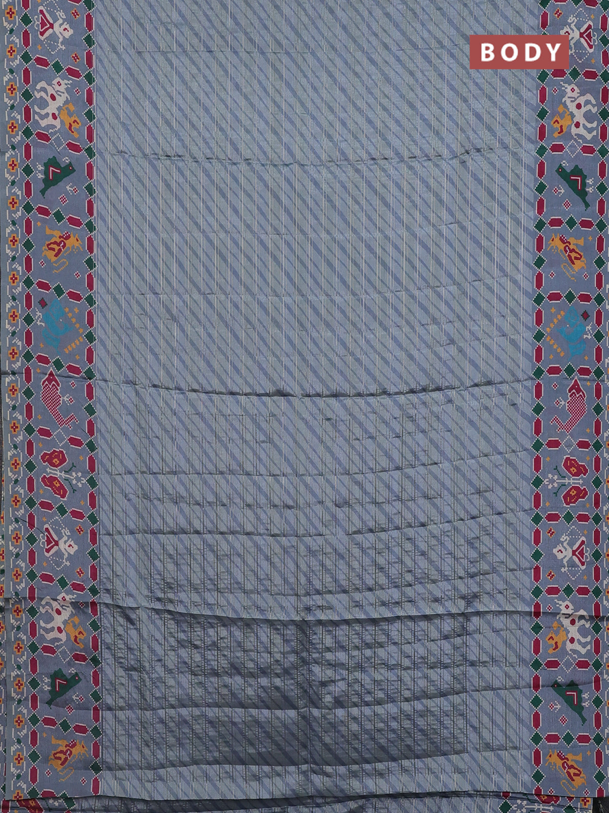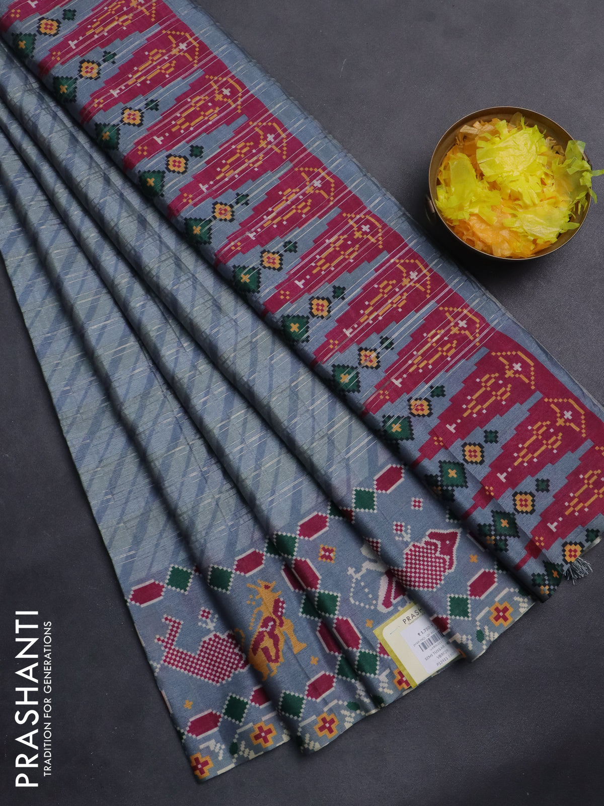 Semi tussar saree pastel grey with leheriya prints and patola printed border