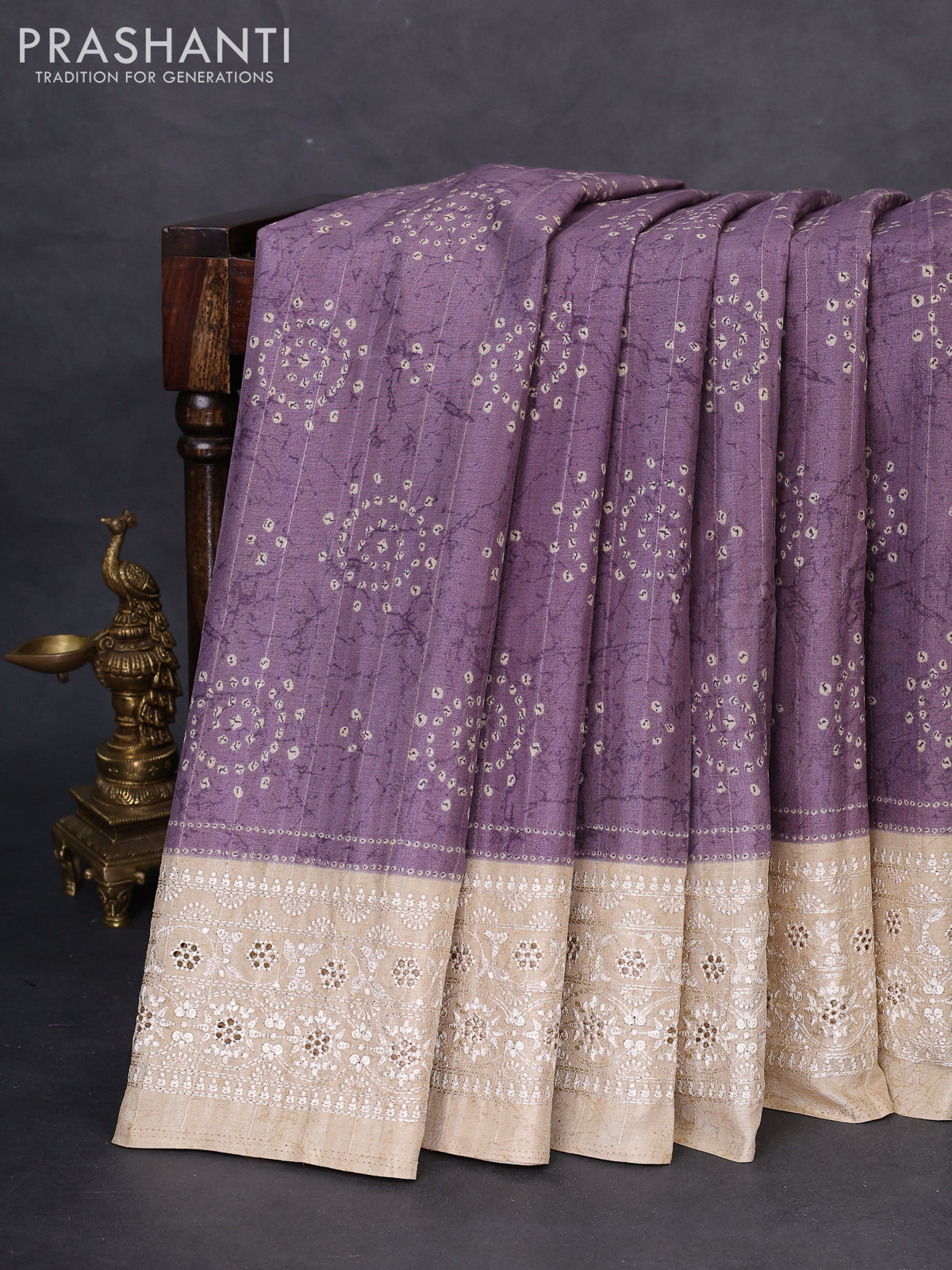 Semi tussar saree pastel lavender and beige with allover bandhani prints and embroidery cut work border