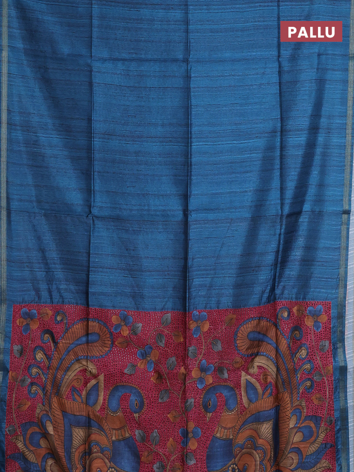 Semi tussar saree peacock blue with plain body and kalamkari prints & cut work pallu