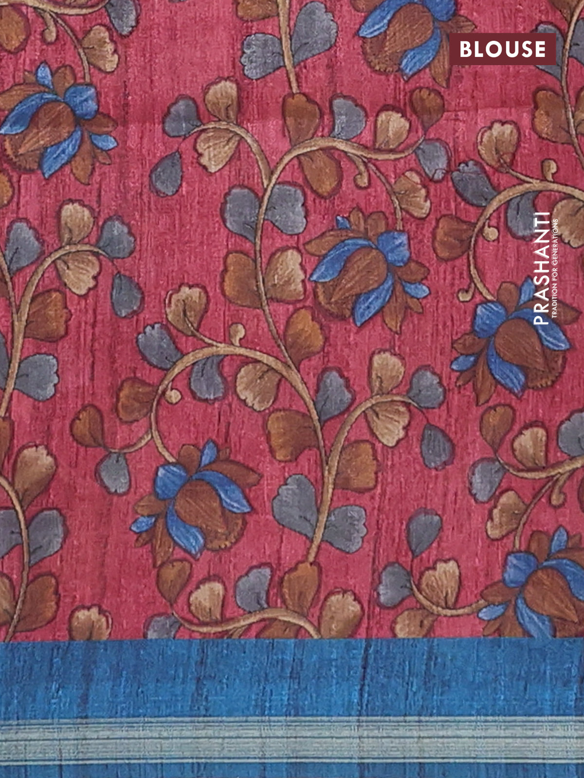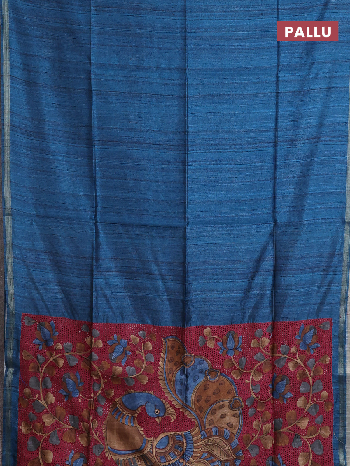 Semi tussar saree peacock blue with plain body and kalamkari prints & cut work pallu