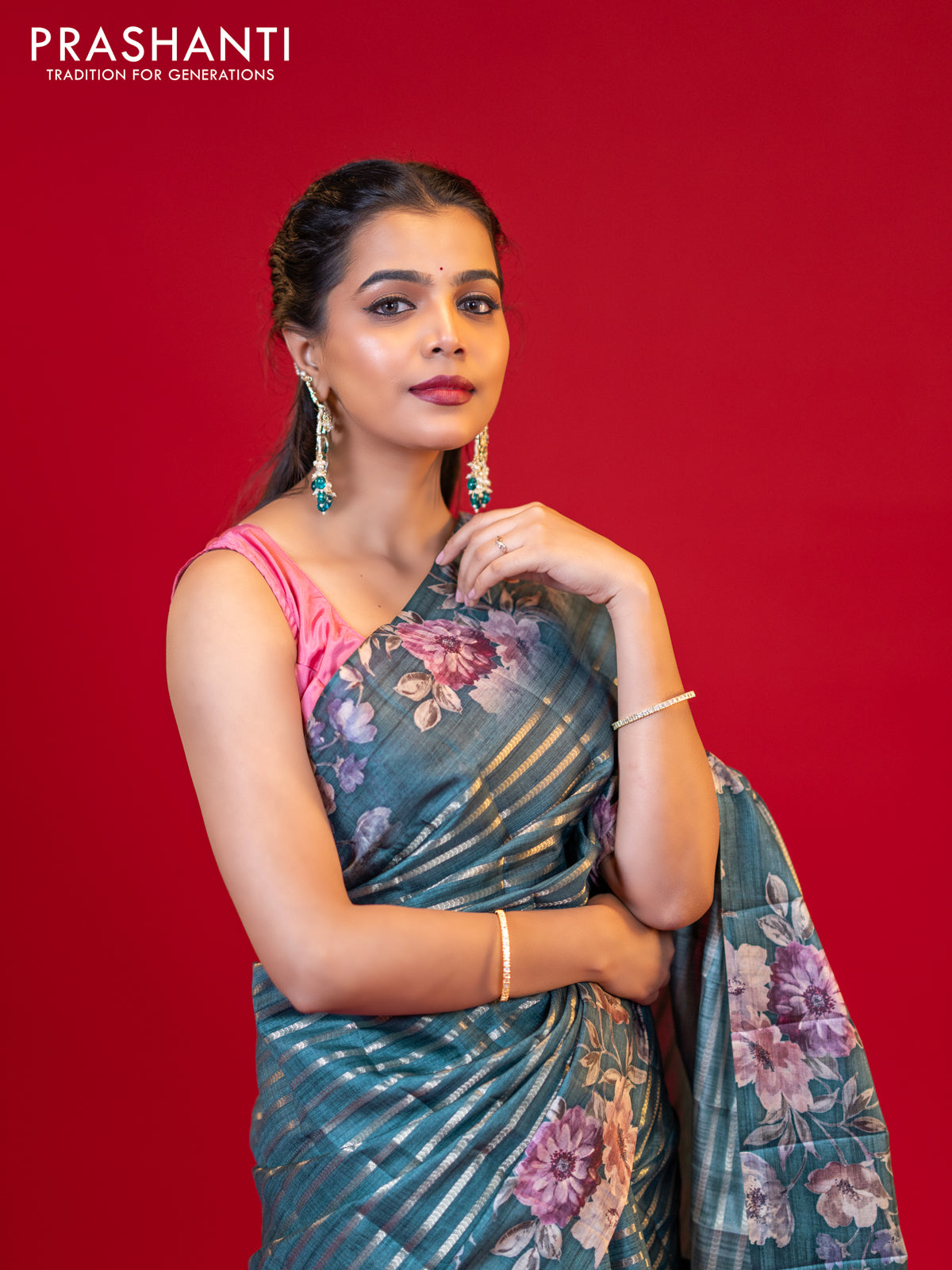 Semi tussar saree peacock green with allover zari woven stripes pattern and floral printed border