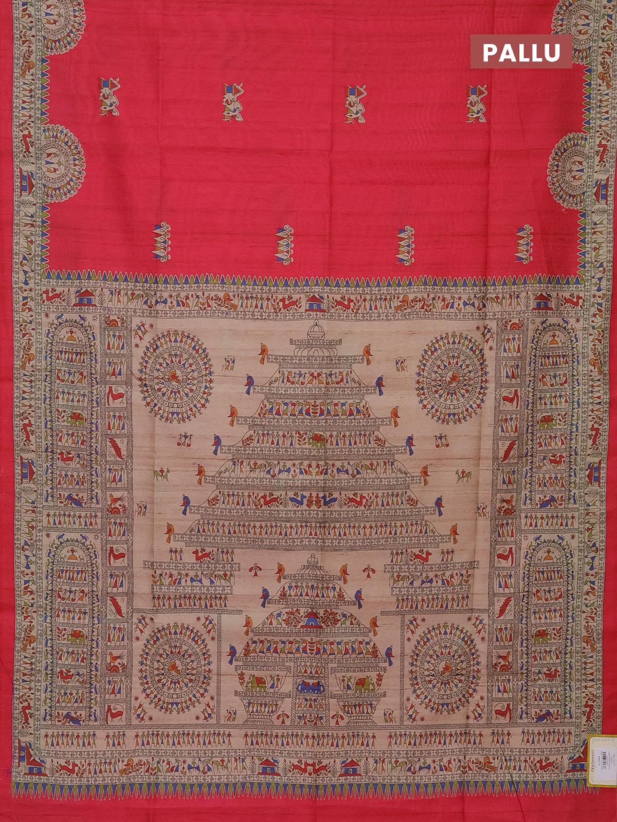 Semi tussar saree pink and beige with allover walri butta prints and printed border