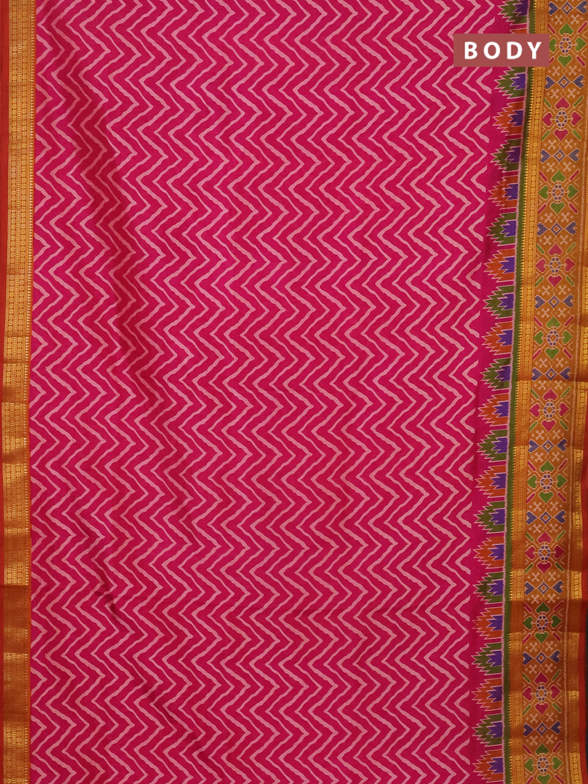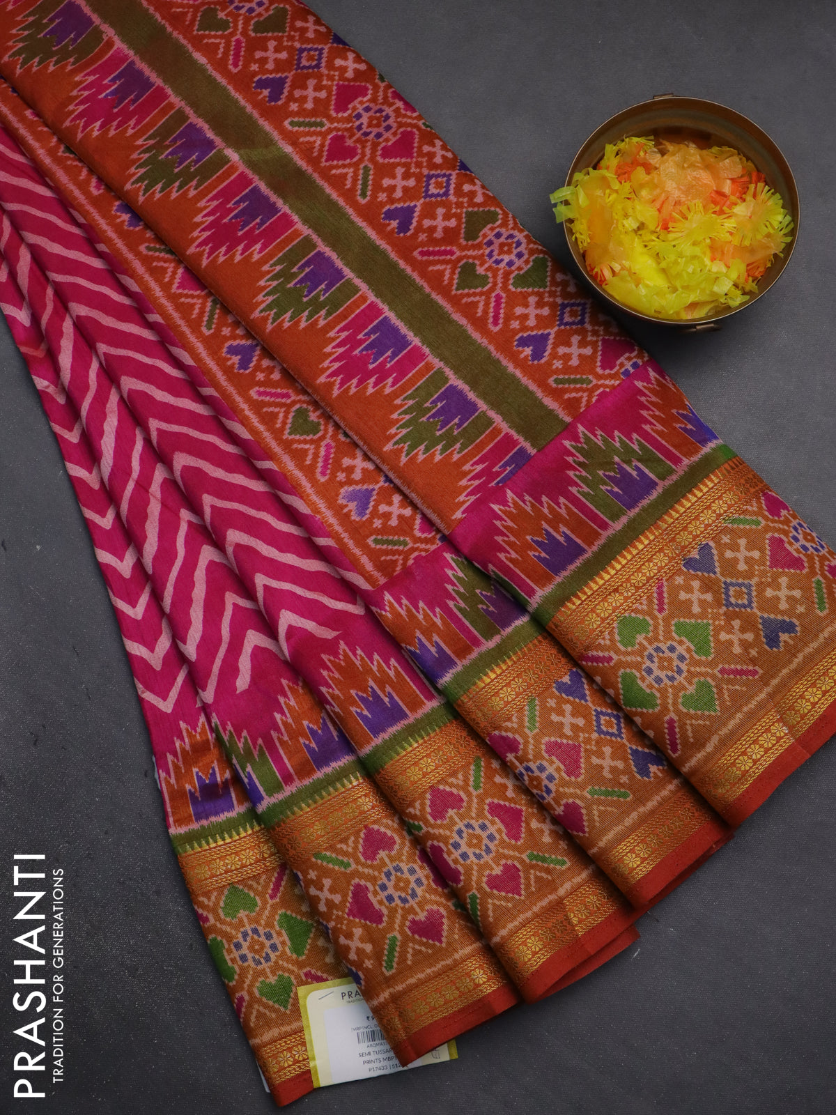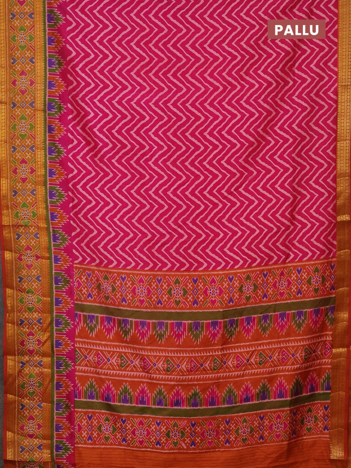 Semi tussar saree pink and dark mustard with allover zig zag prints and zari woven ikat border