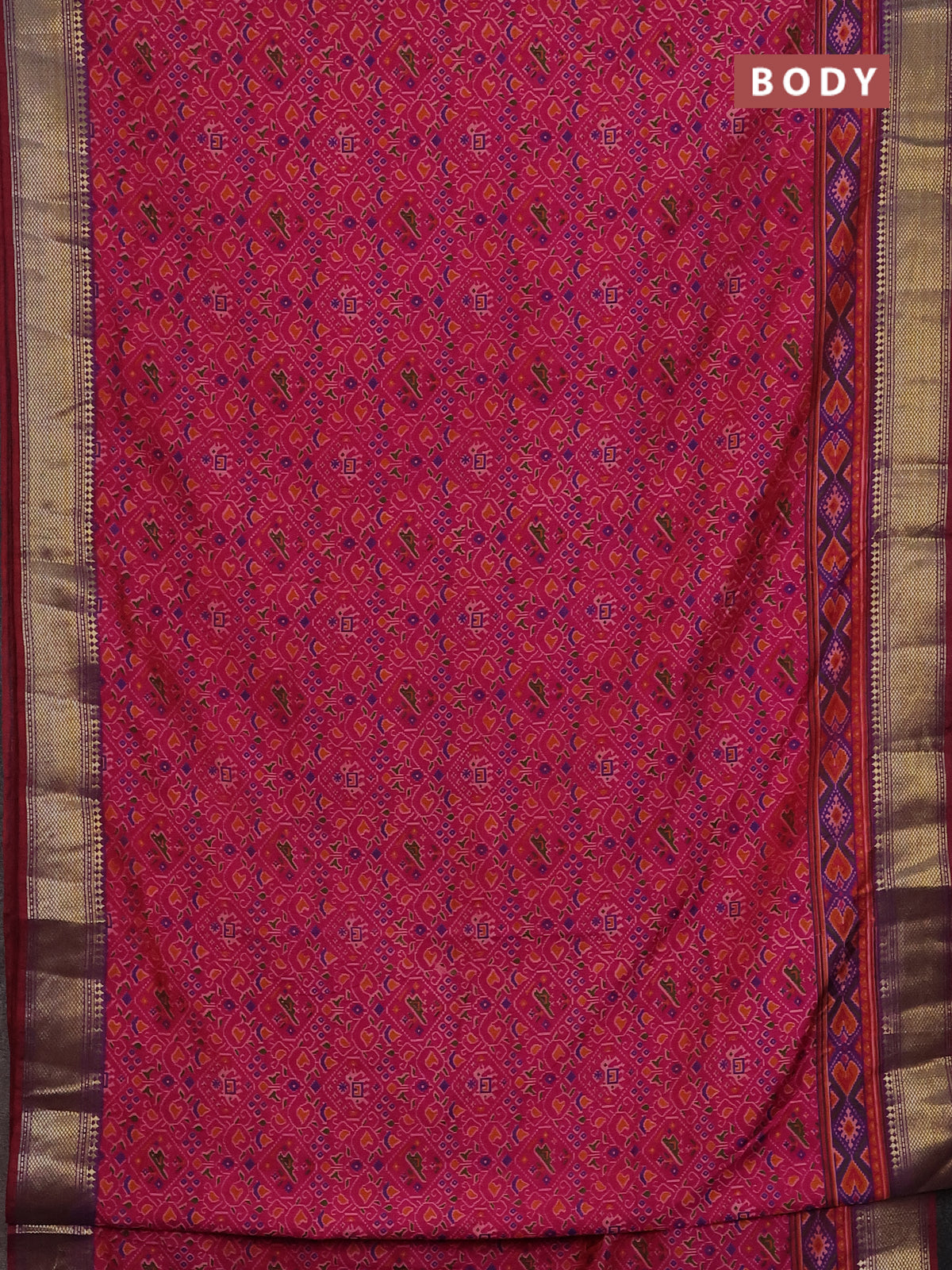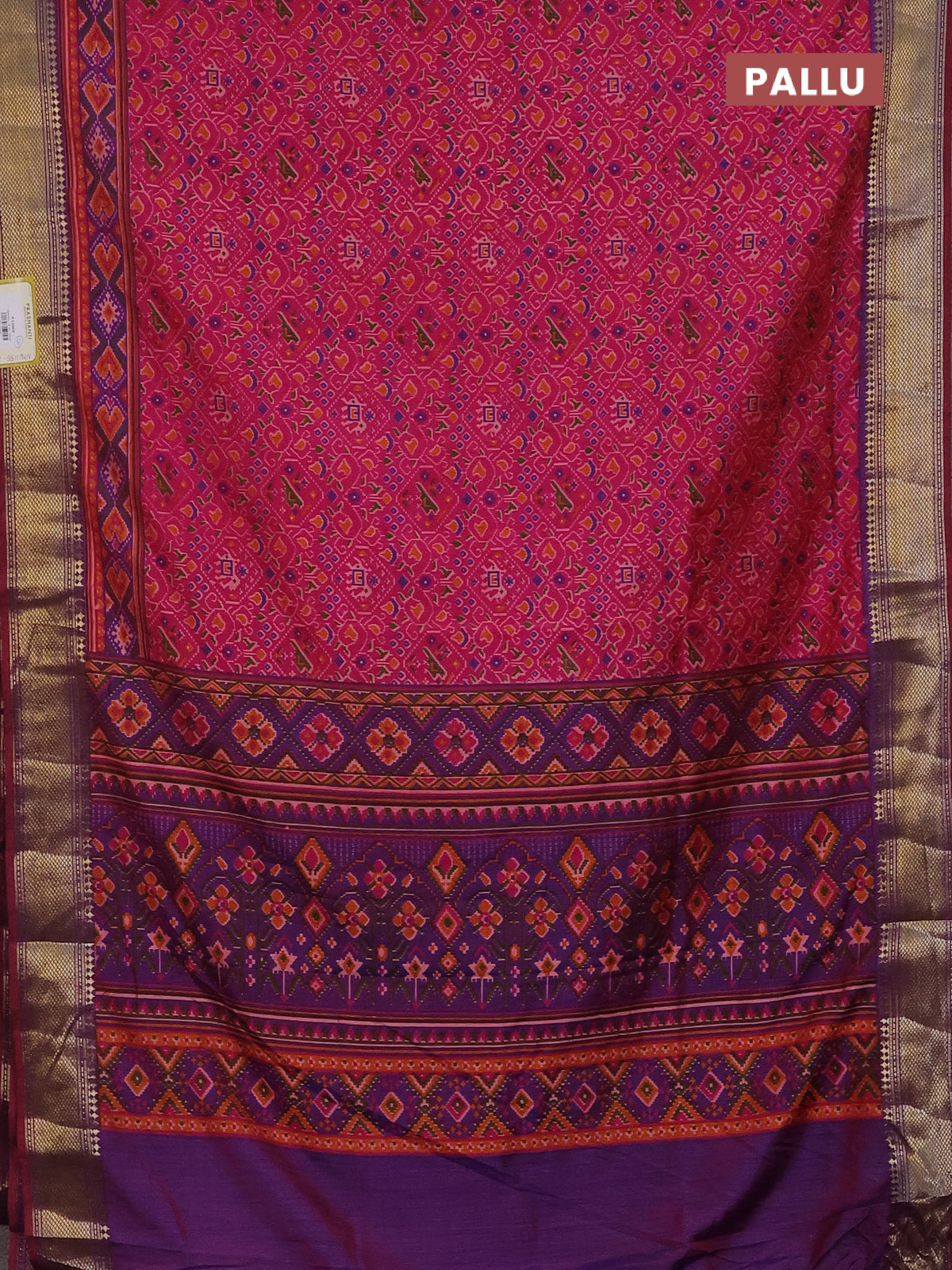 Semi tussar saree pink and dual shade of maroon with allover ikat prints and zari woven border