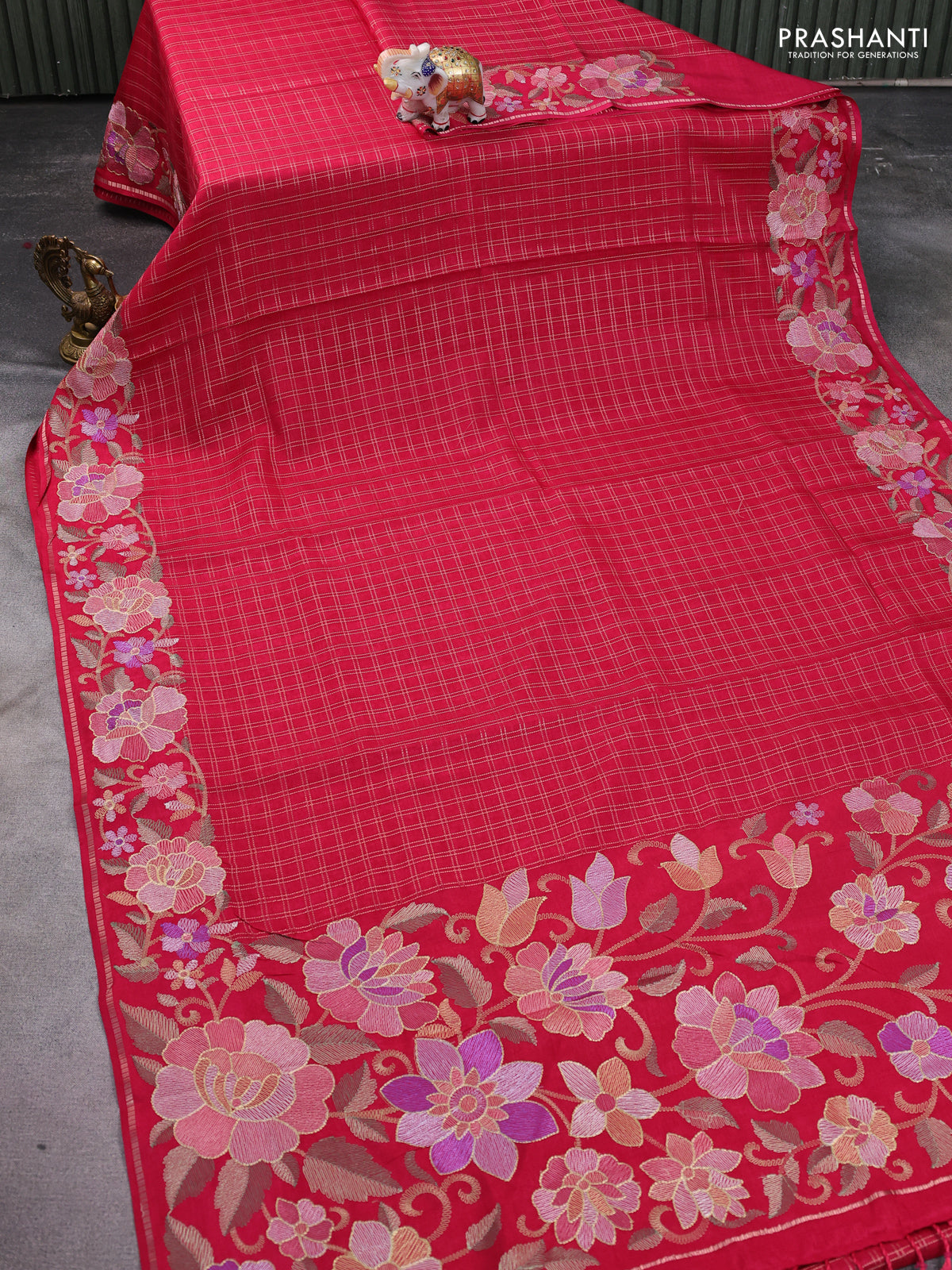 Semi tussar saree pink with allover zari checked pattern and embroidery border
