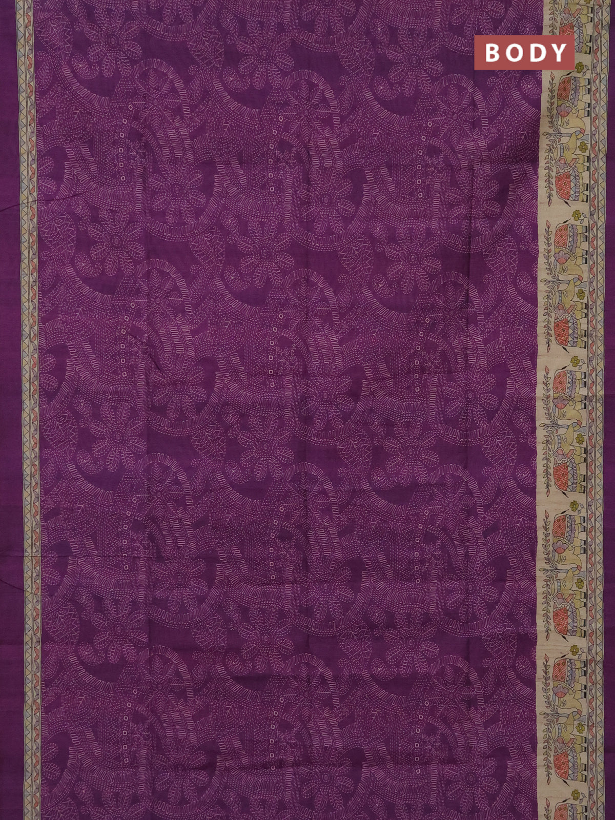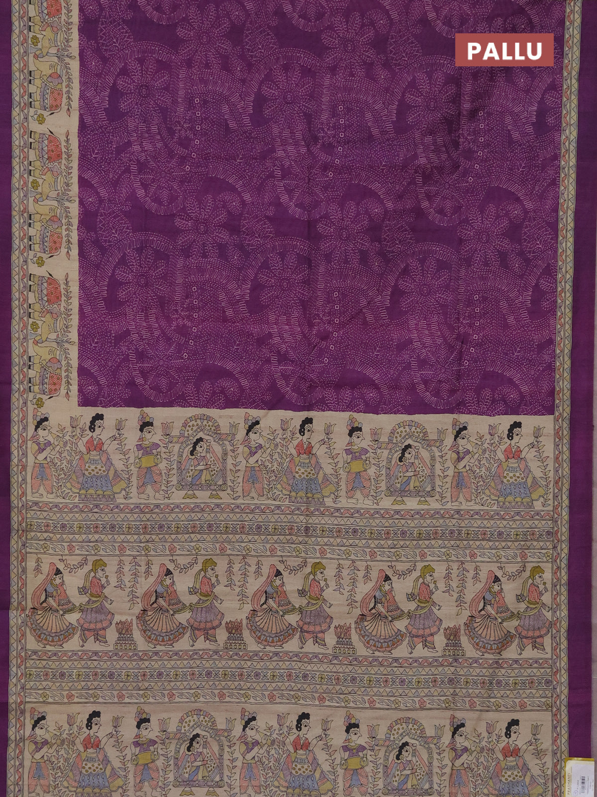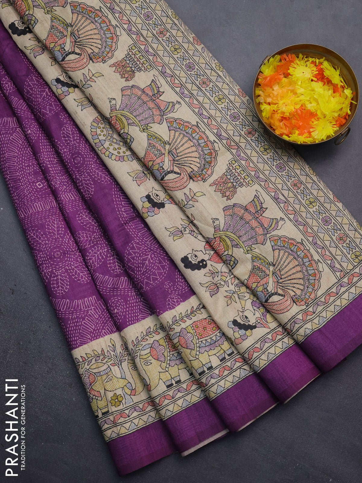 Semi tussar saree purple and beige with allover prints and mandhubani printed pallu