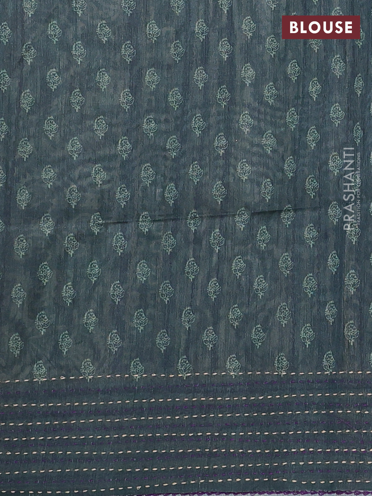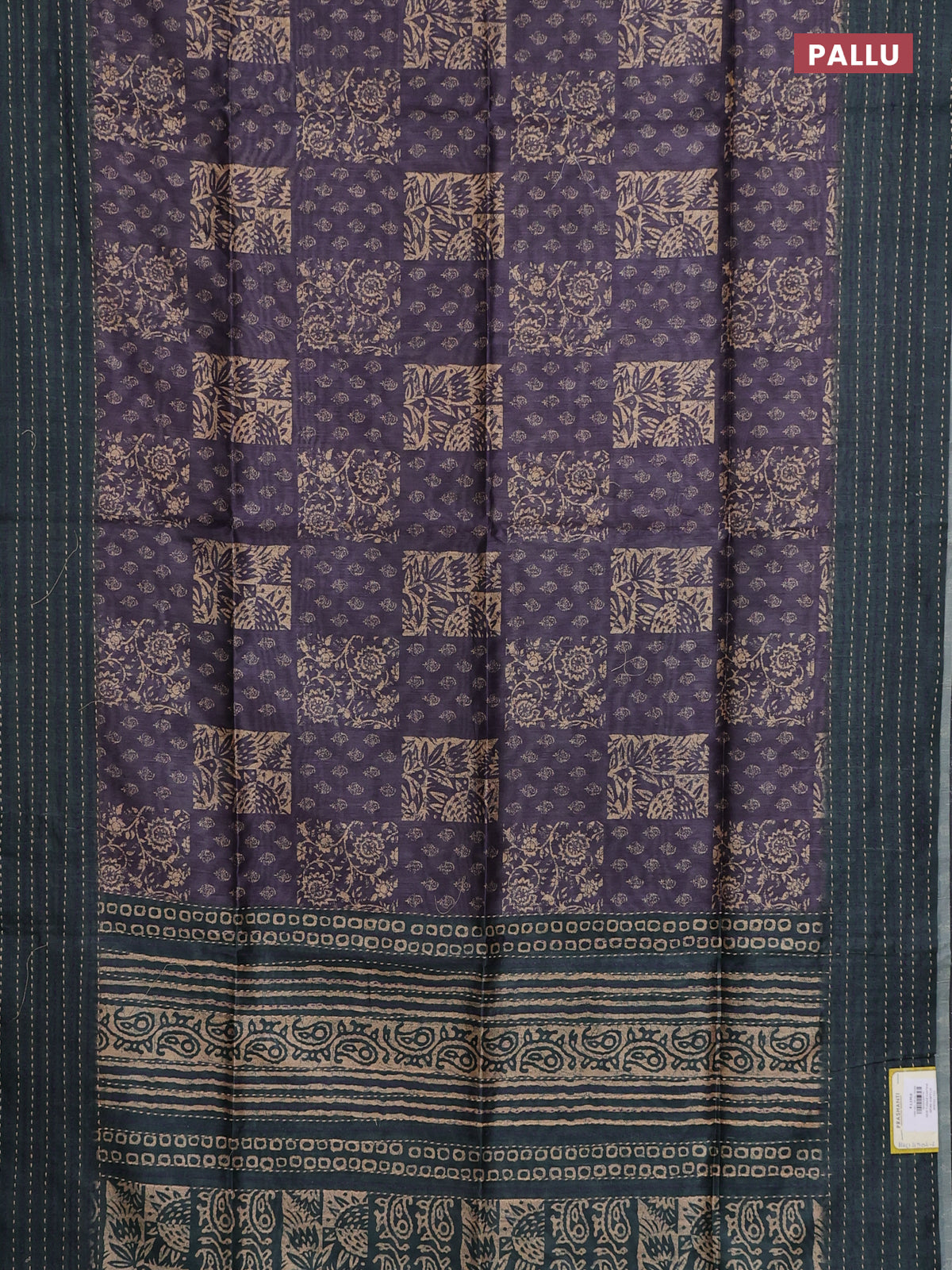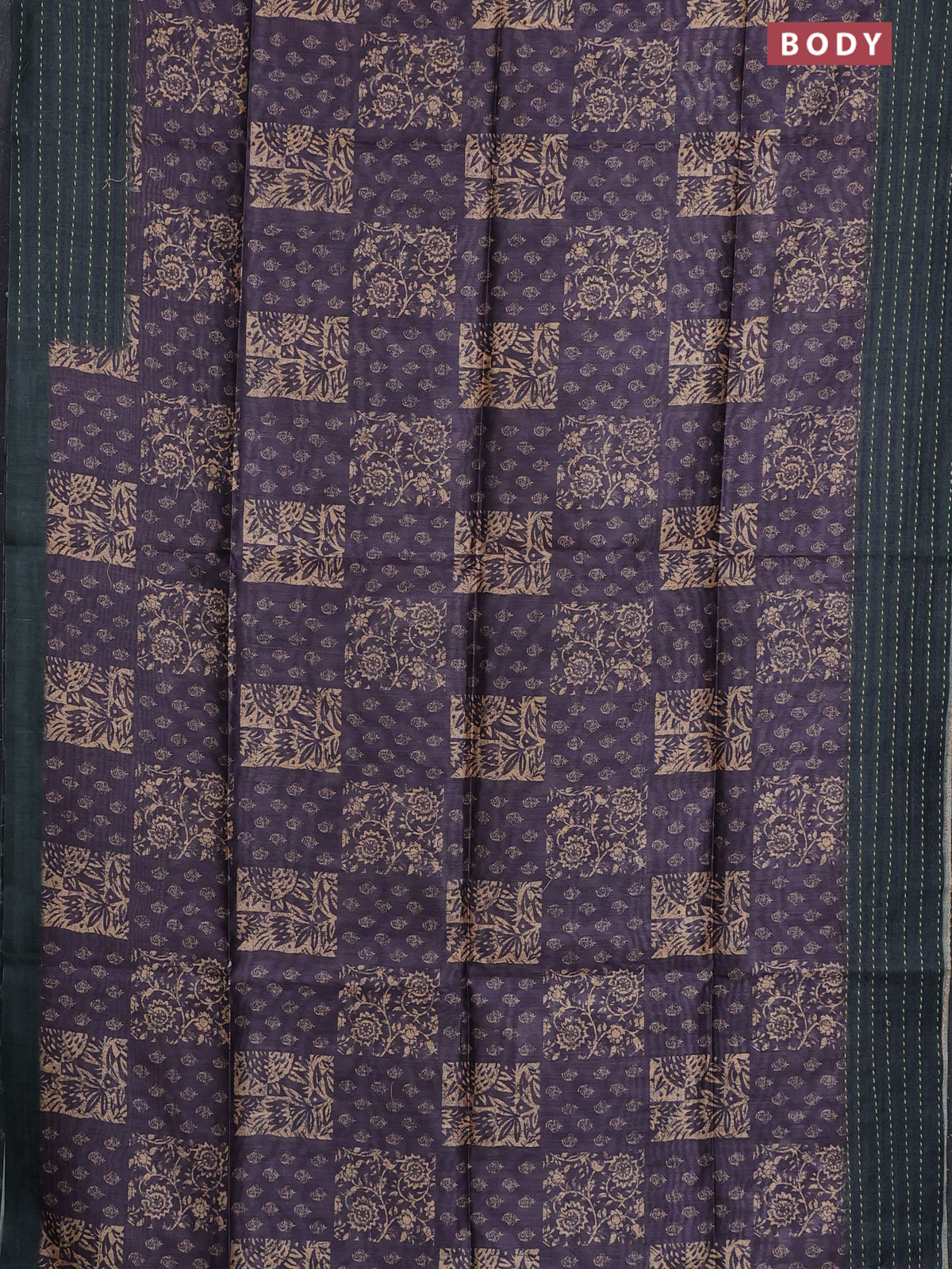 Semi tussar saree purple and dark green with allover batik prints and katha stitch work pallu & border
