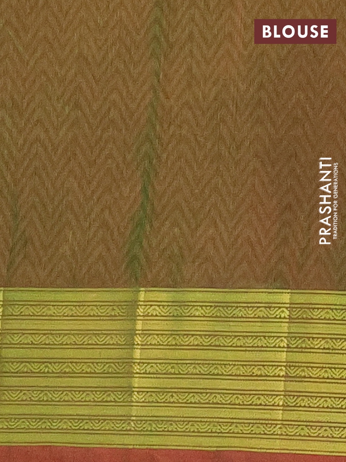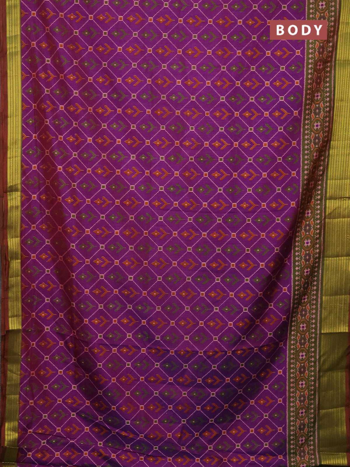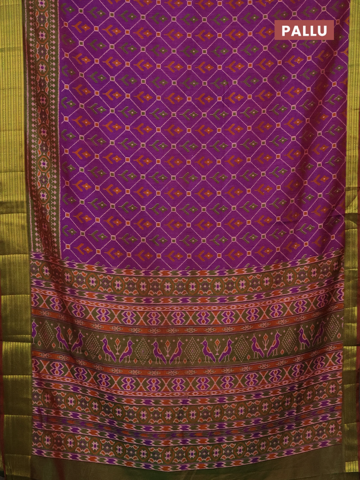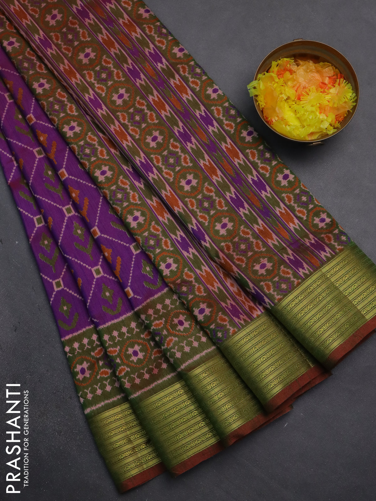 Semi tussar saree purple and dual shade of green with allover ikat prints and zari woven border