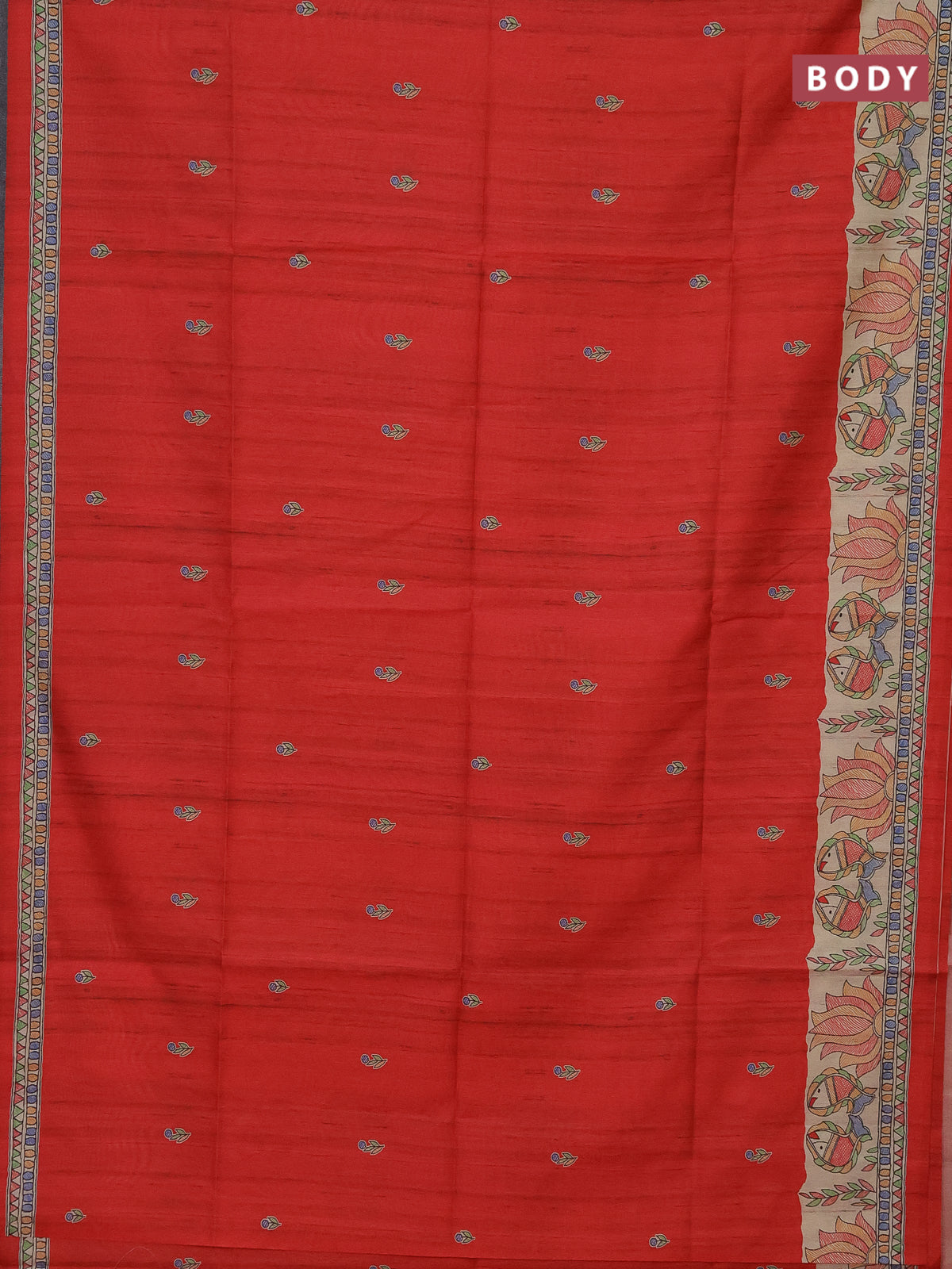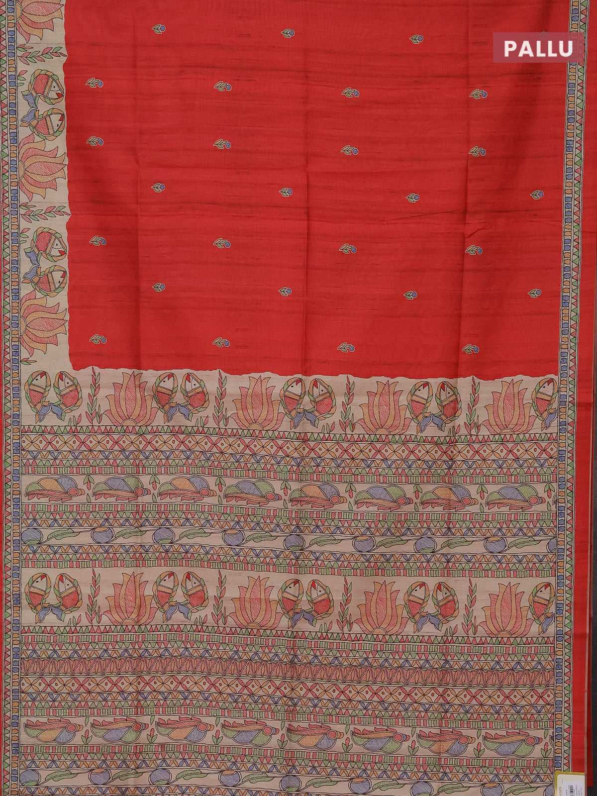 Semi tussar saree red and beige with butta prints and madhubani printed pallu