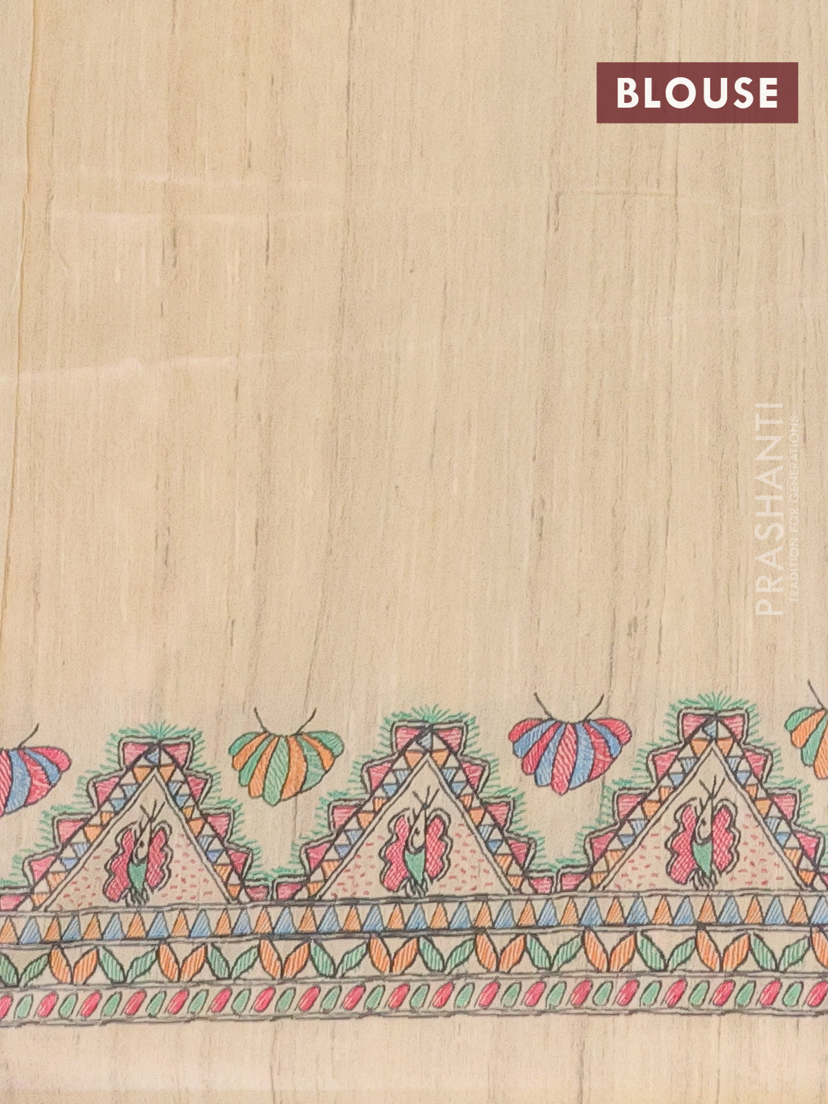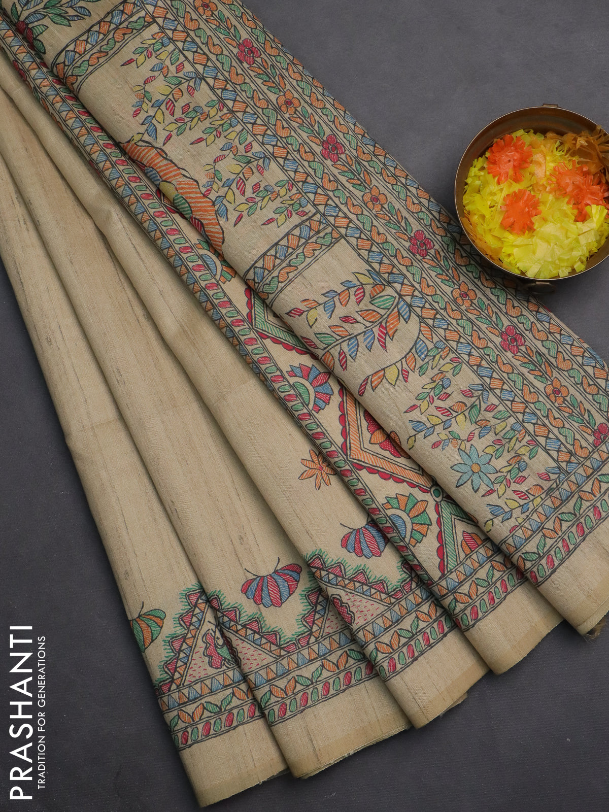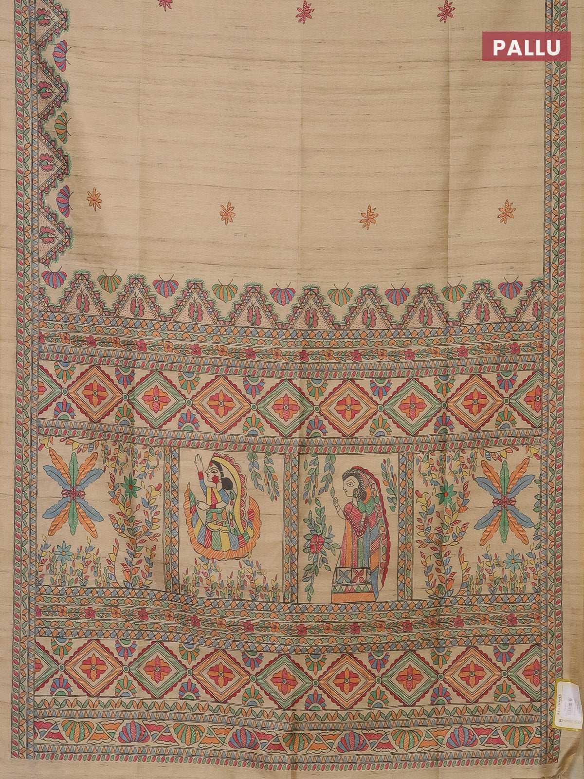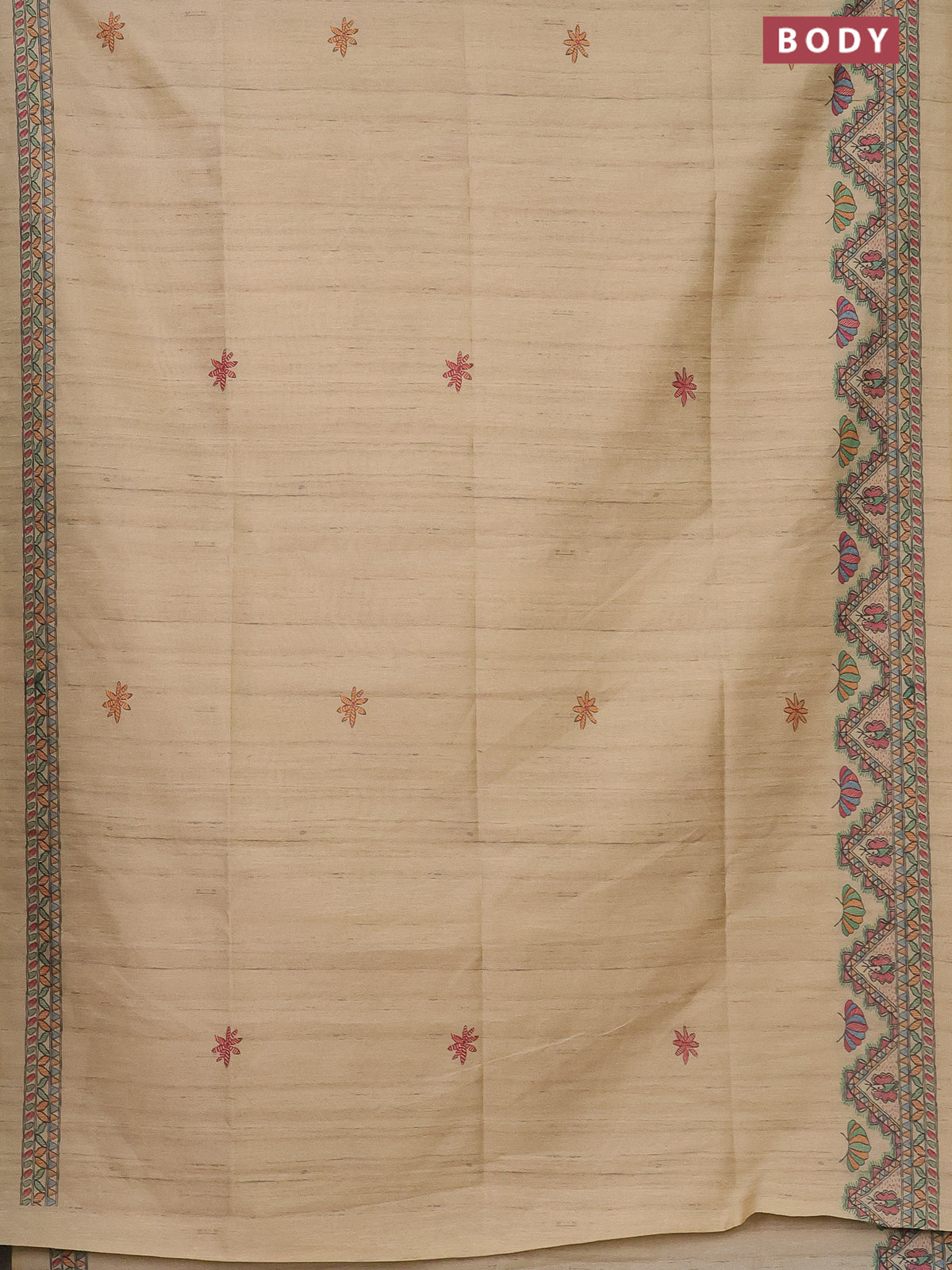 Semi tussar saree sandal with butta prints and madhubani printed pallu