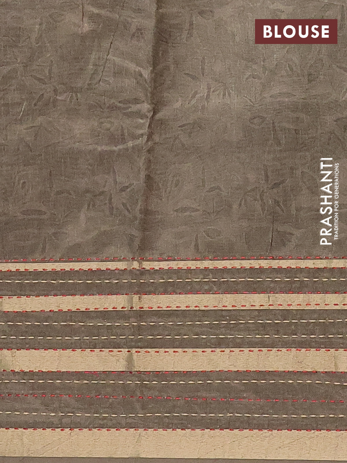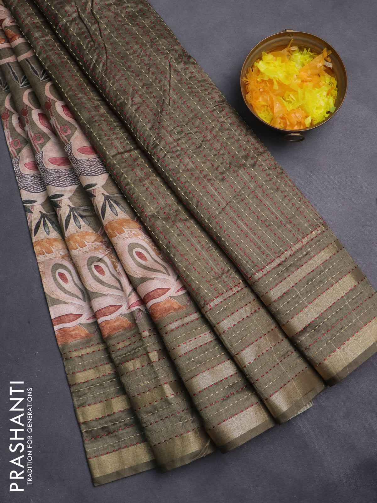 Semi tussar saree sap green with allover prints and kantha stitch work border