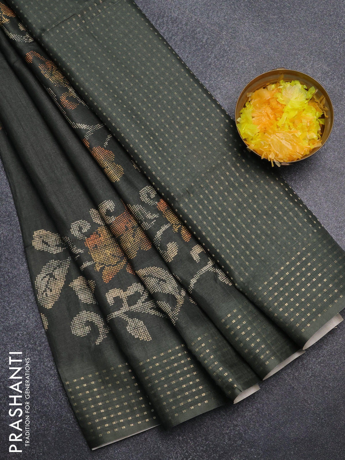 Semi tussar saree sap green with floral prints and zari woven pallu