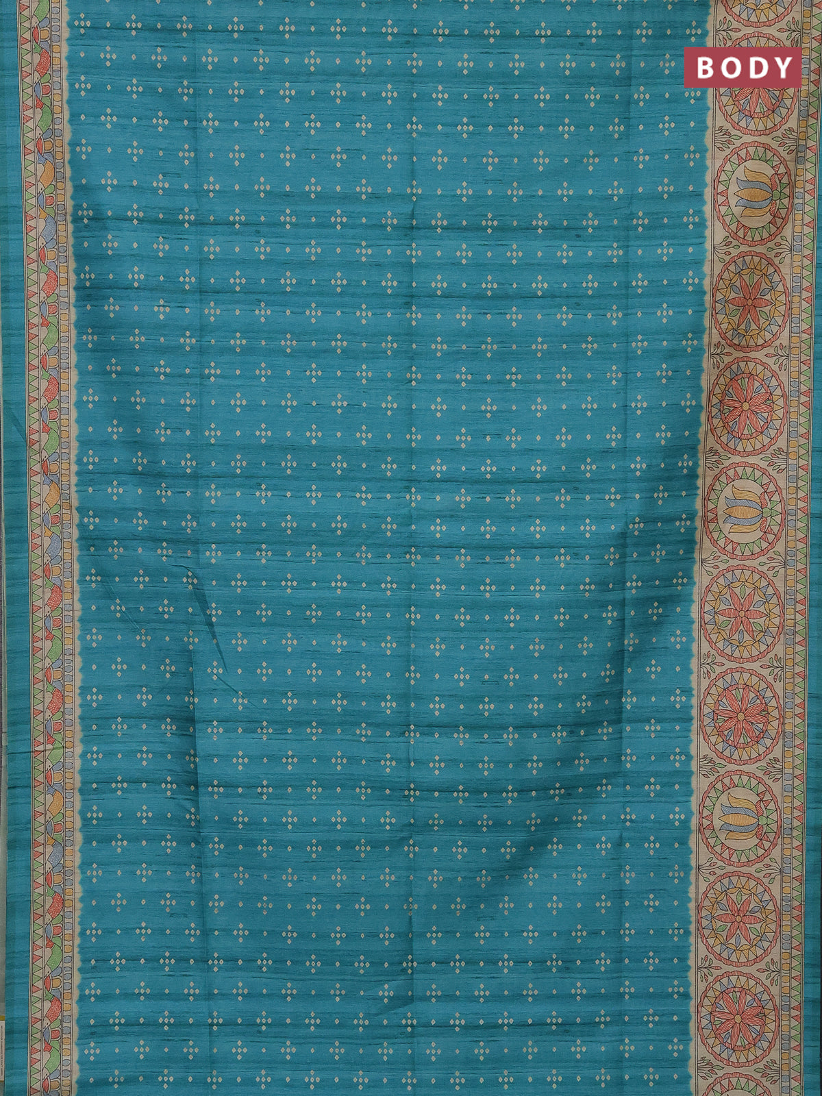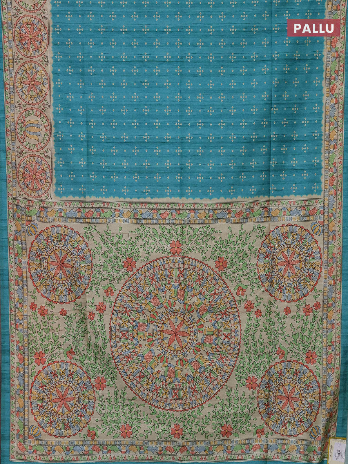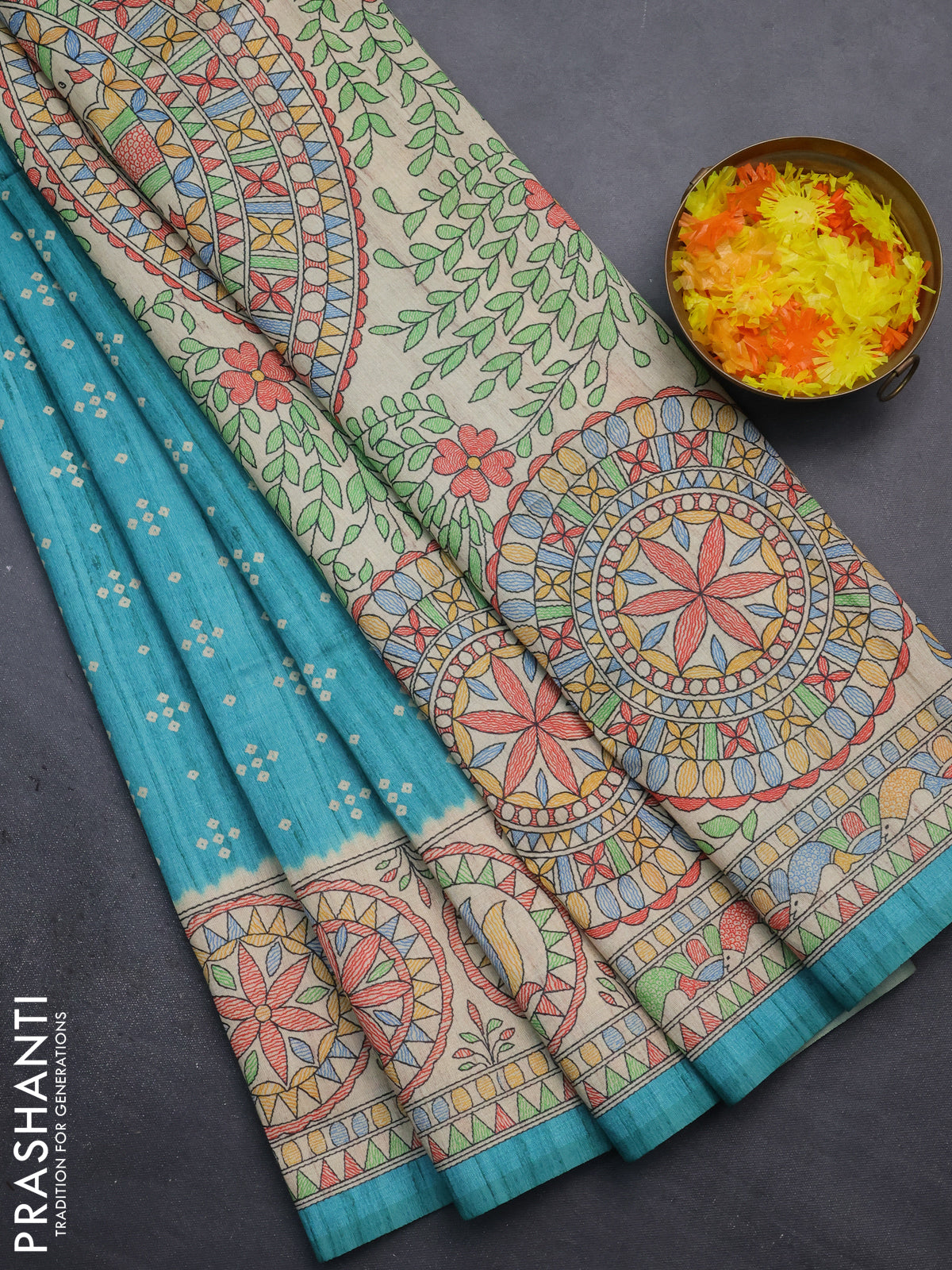 Semi tussar saree teal blue and beige with bandhini butta prints and mandhubani printed pallu
