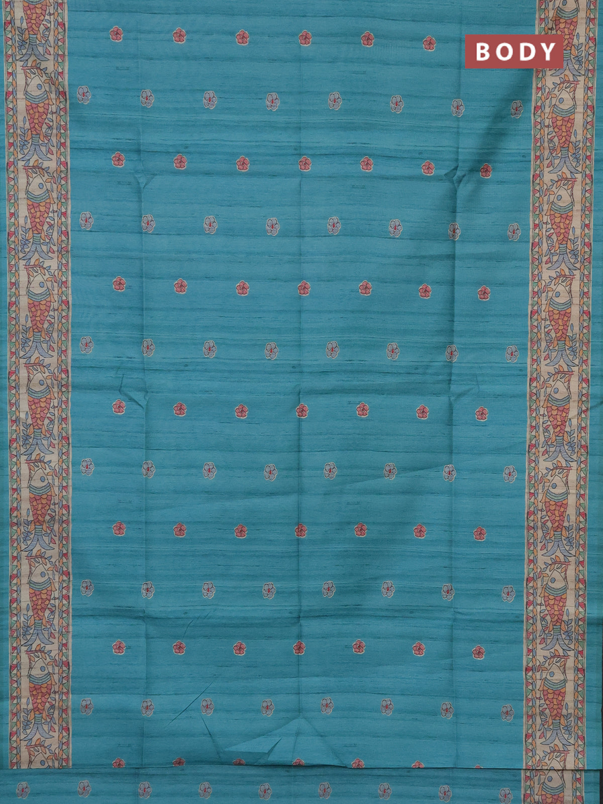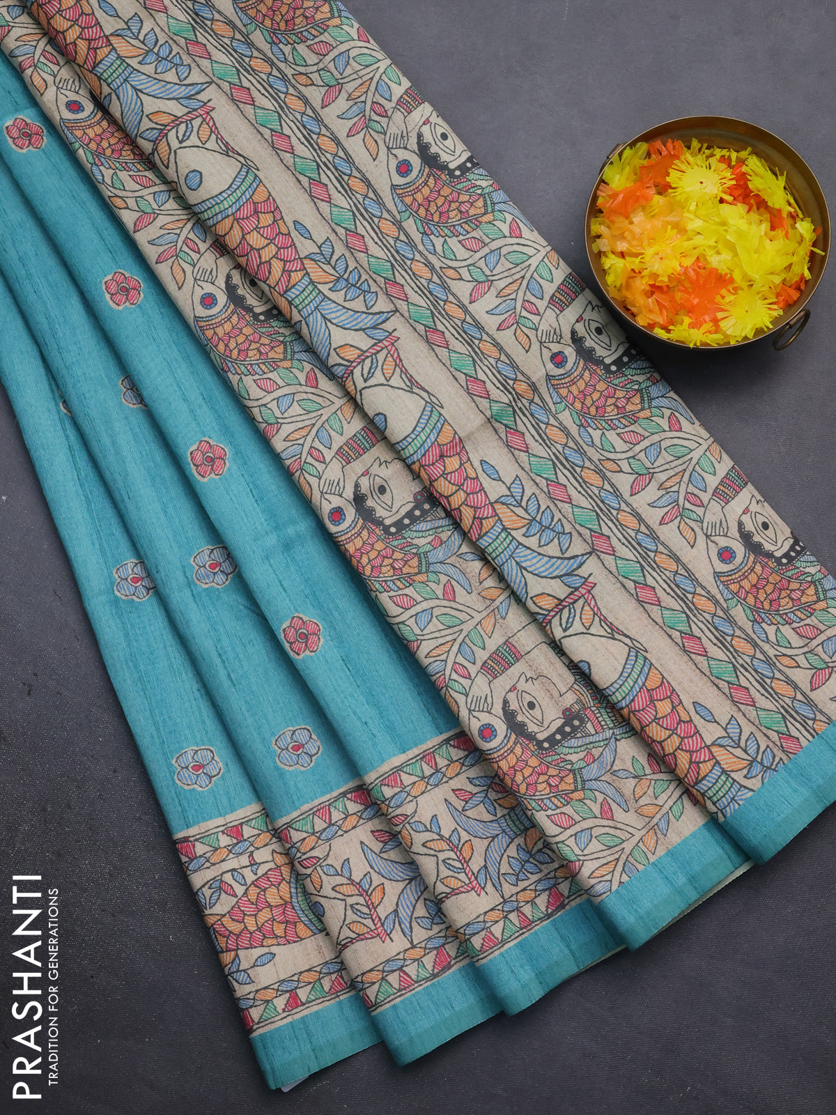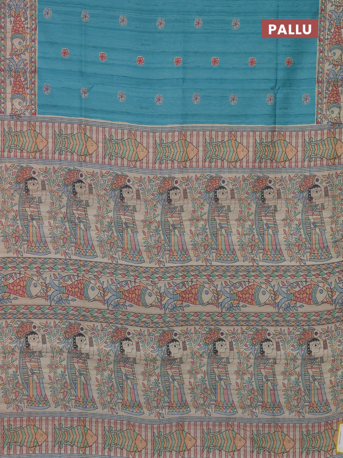 Semi tussar saree teal blue and beige with butta prints and madhubani printed pallu