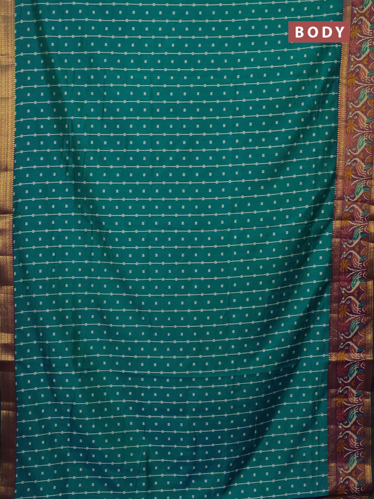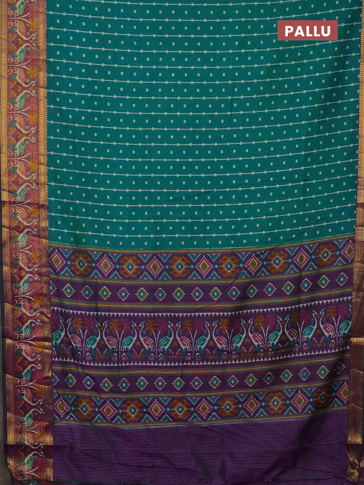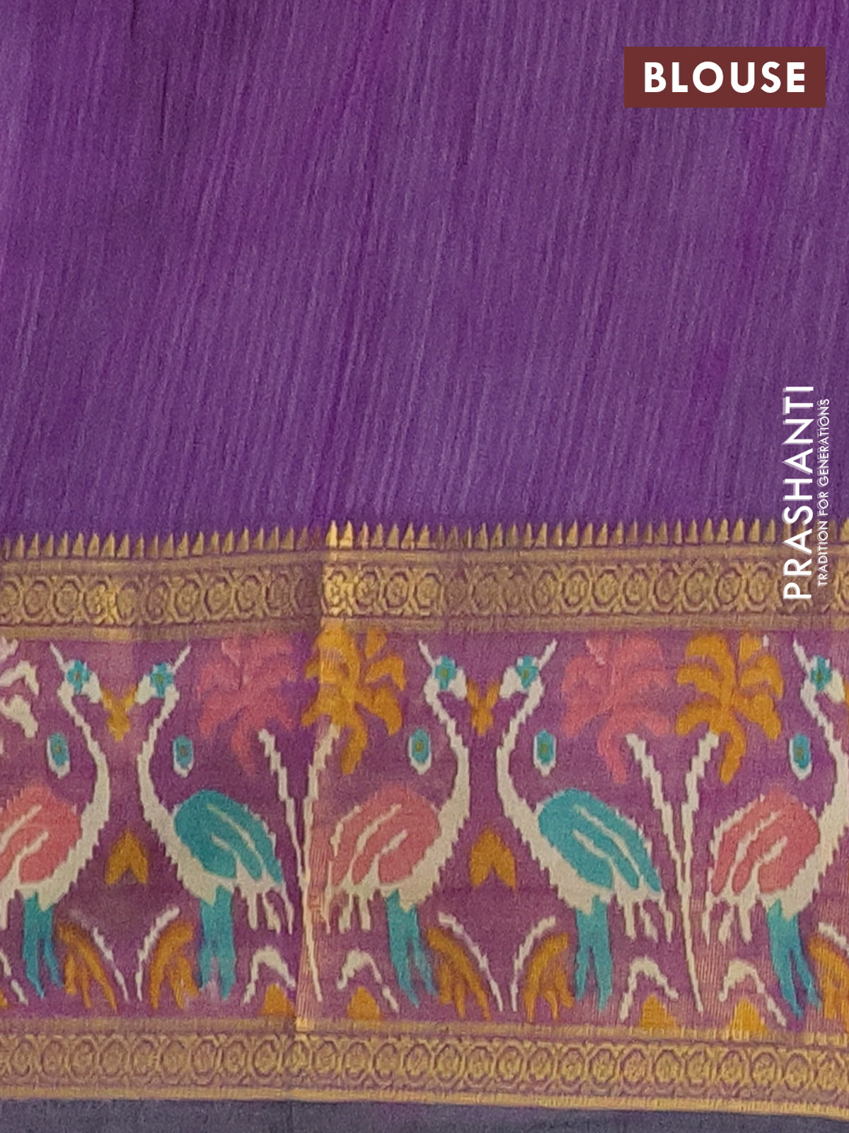 Semi tussar saree teal bluish green and purple with allover ikat prints and zari woven ikat border