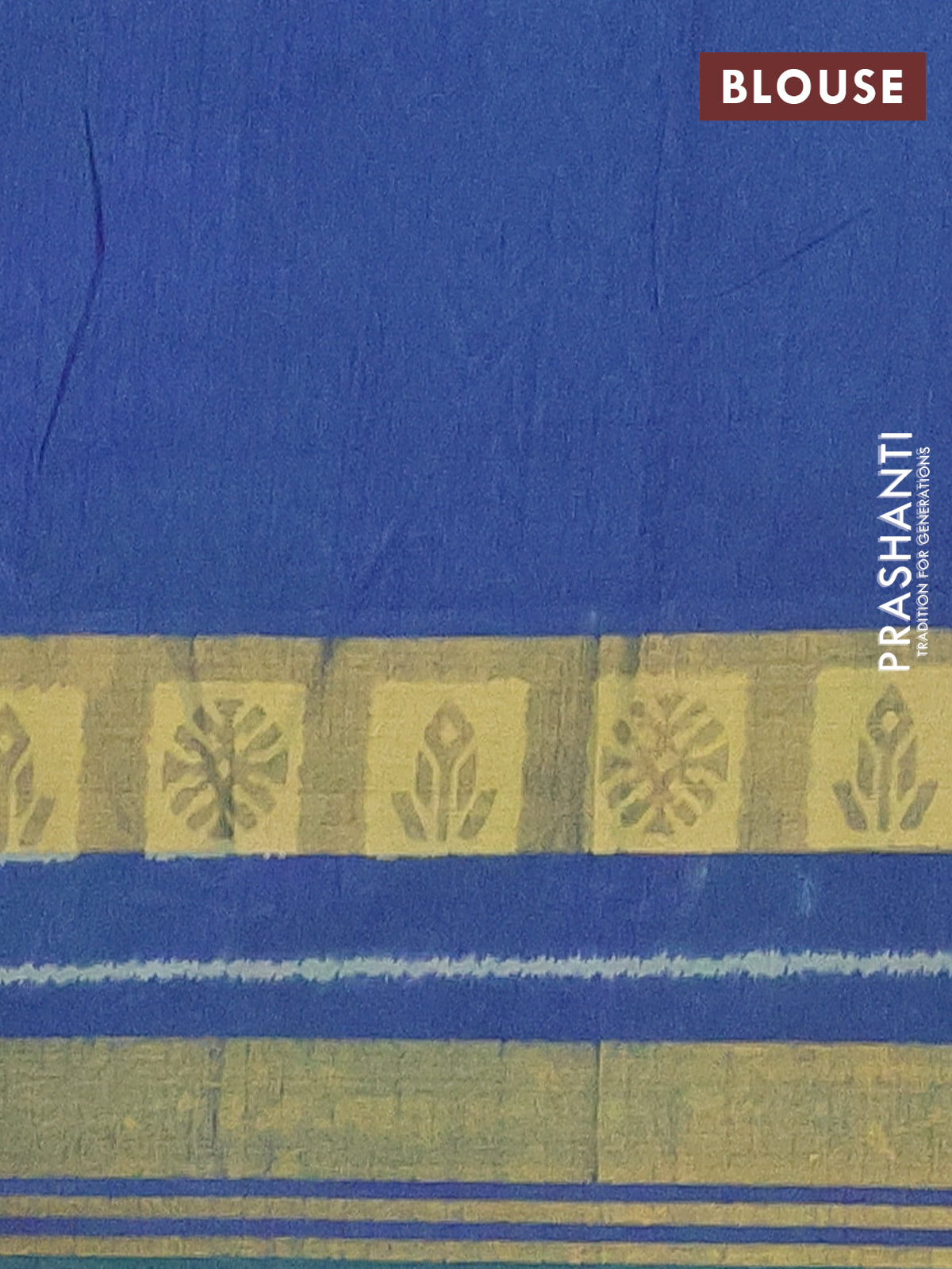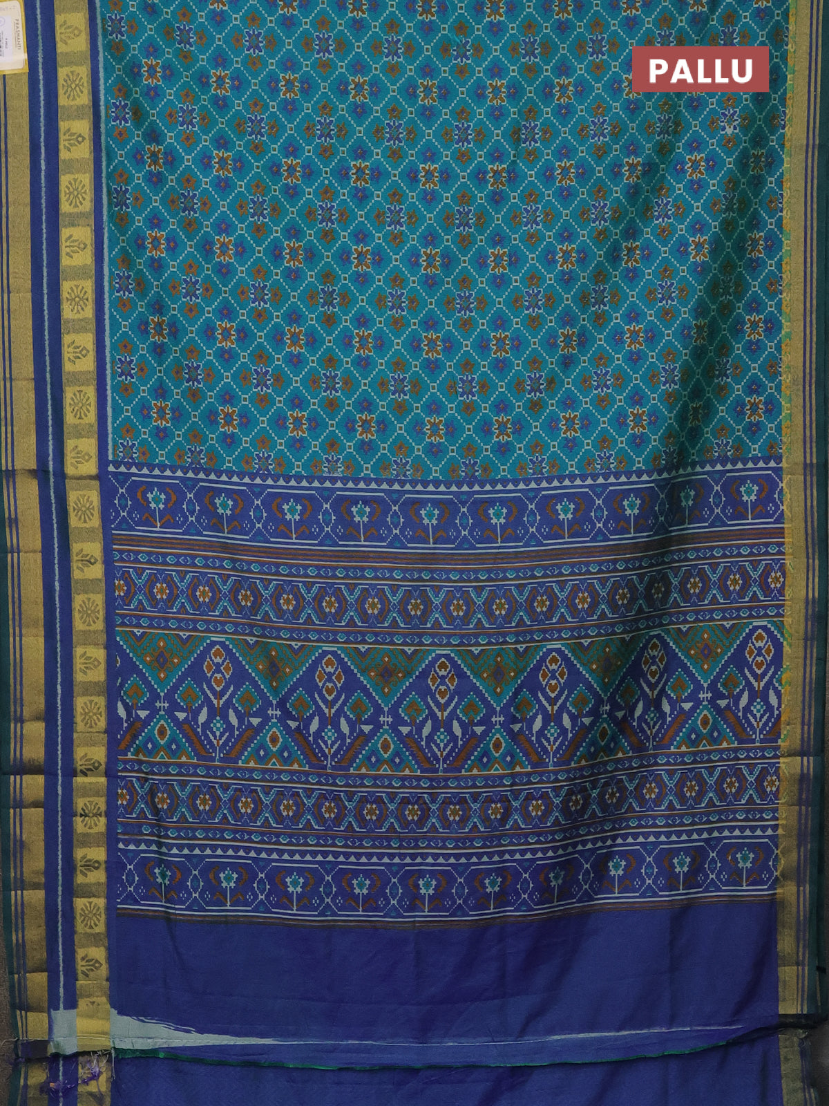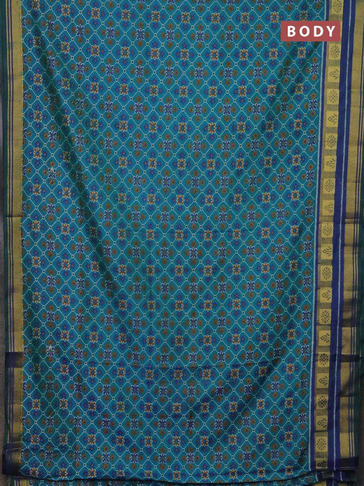 Semi tussar saree teal green and dual shade of blue with allover ikat prints and zari woven border
