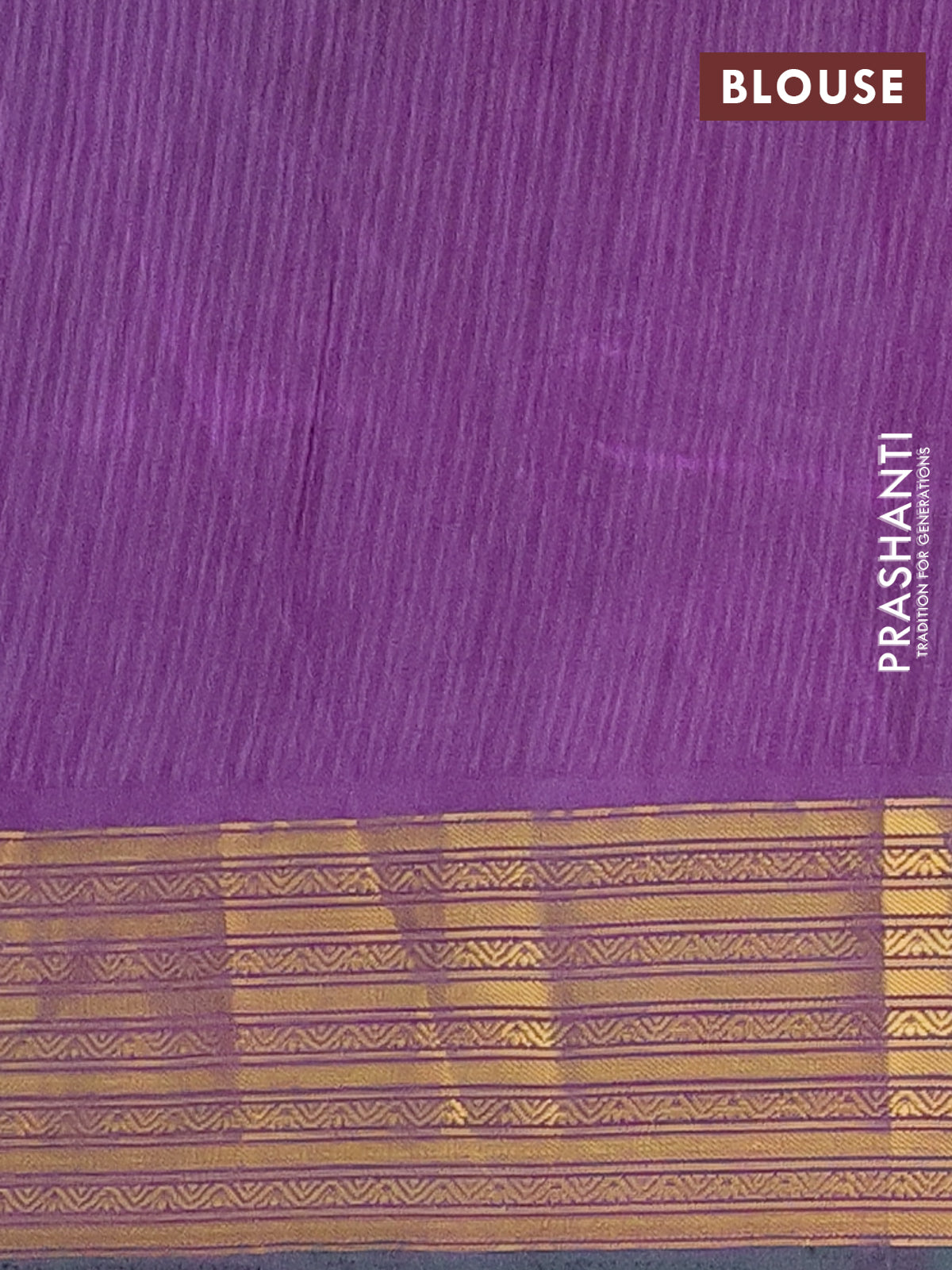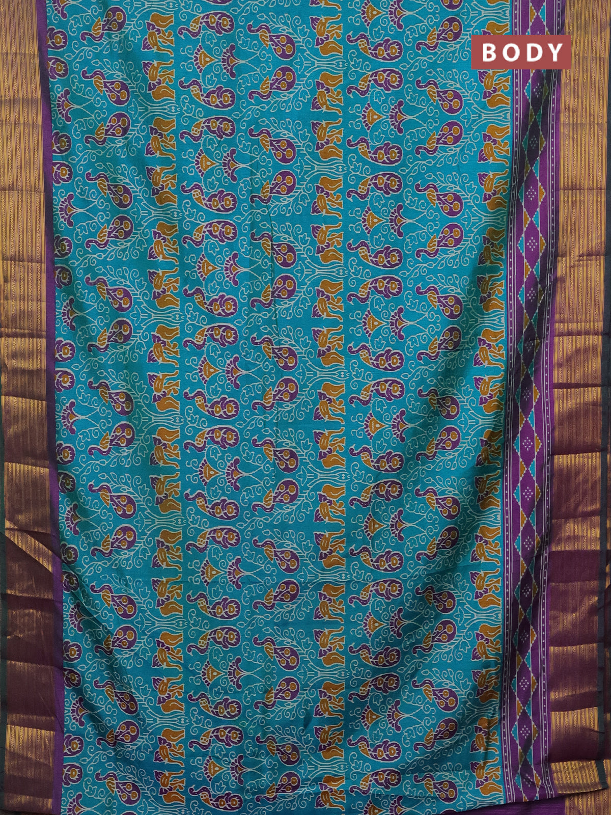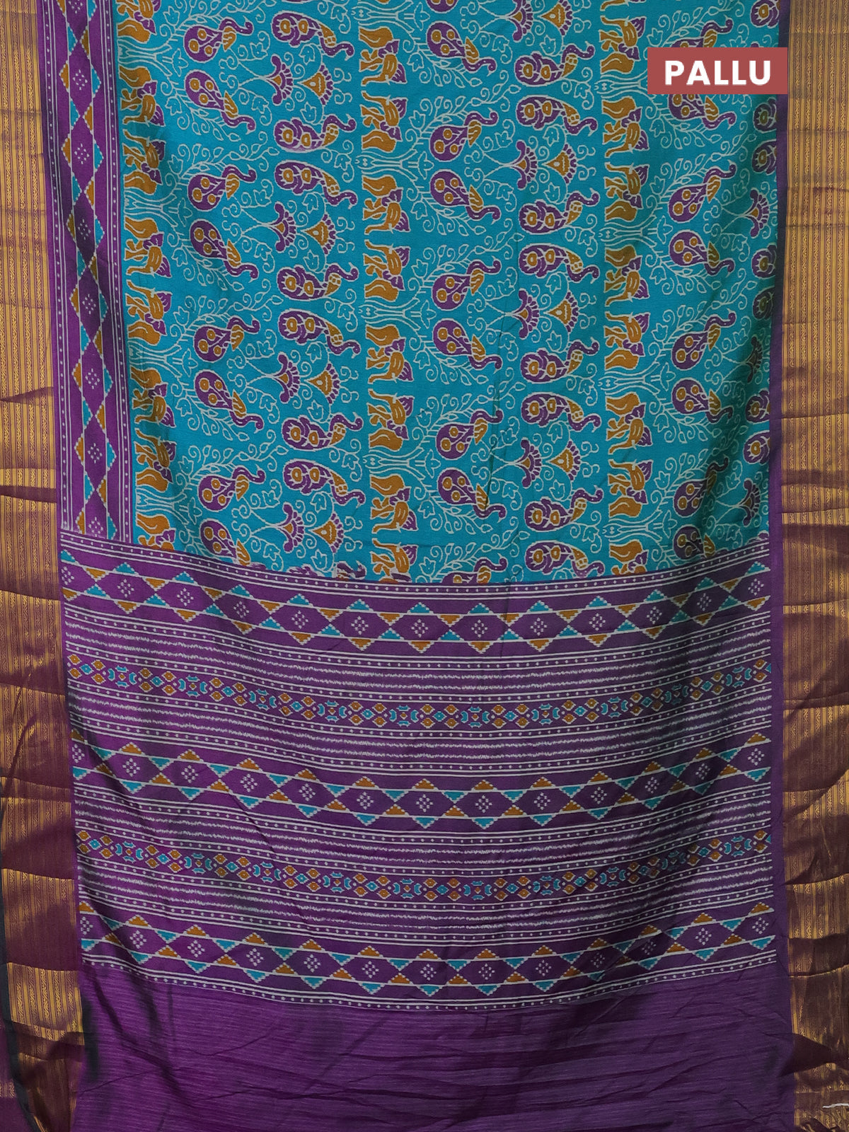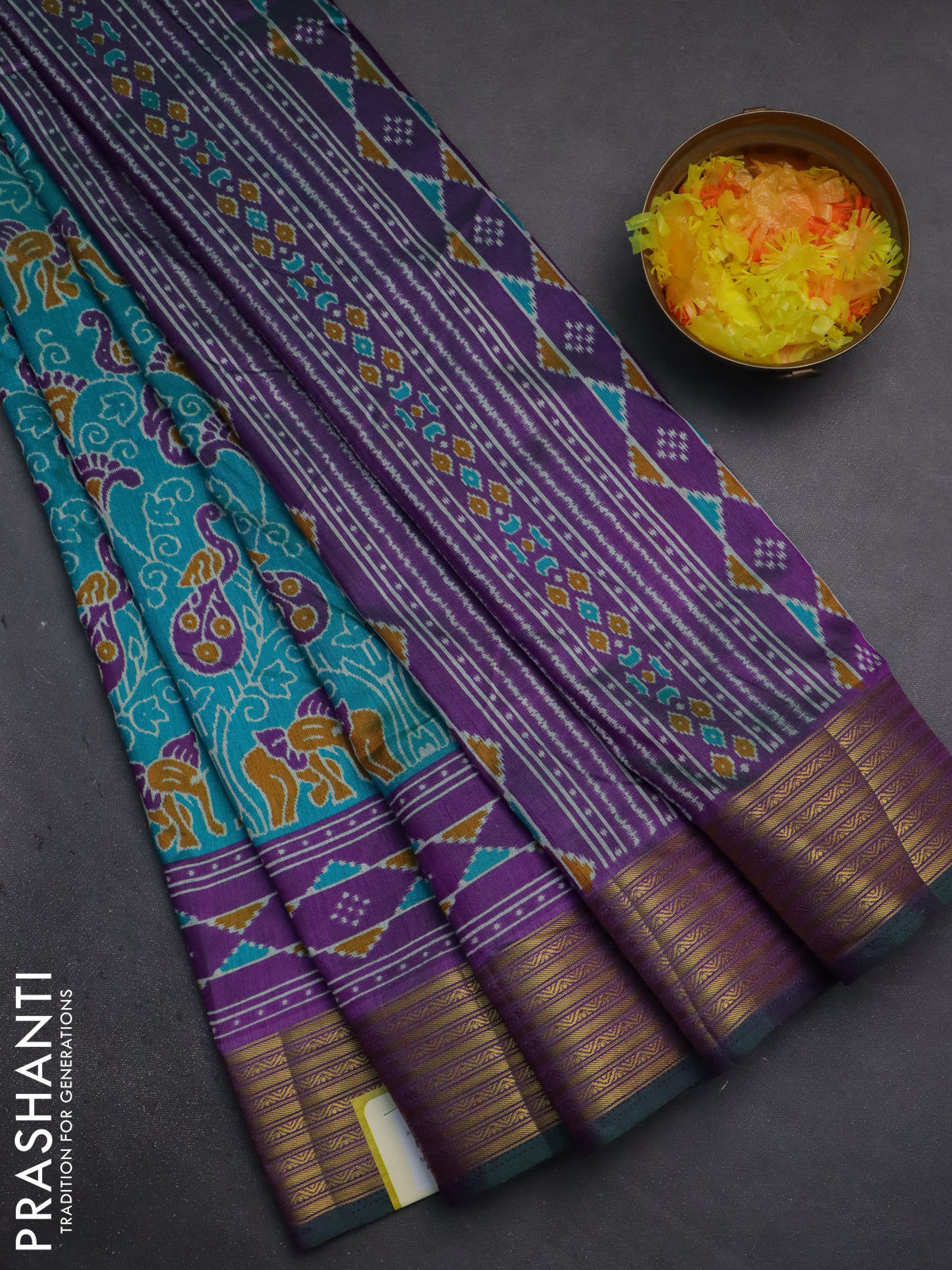 Semi tussar saree teal green and purple with allover ikat prints and zari woven border