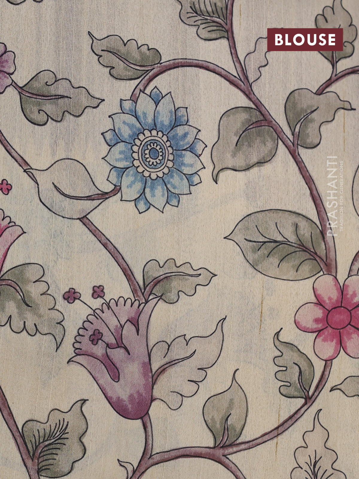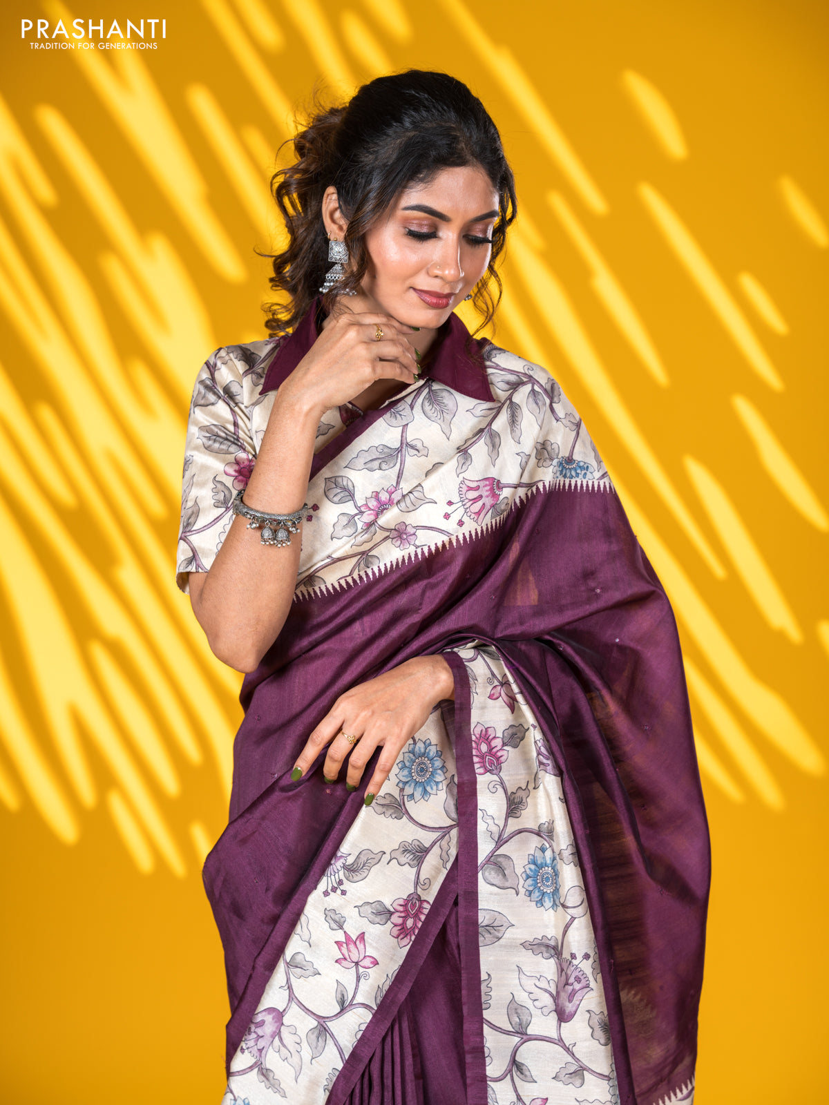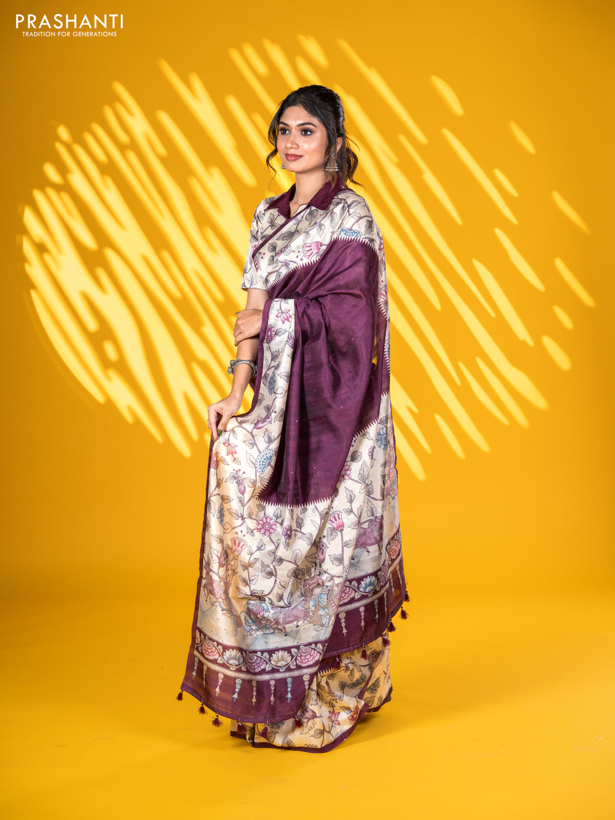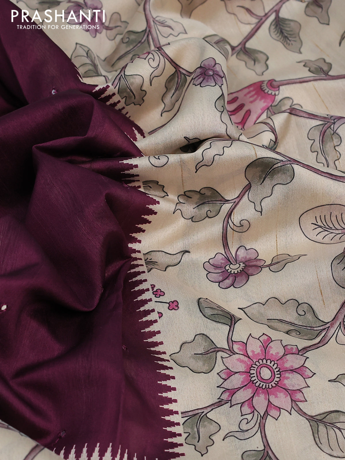 Semi tussar saree wine shade and cream with allover mirror work and kalamkari printed border
