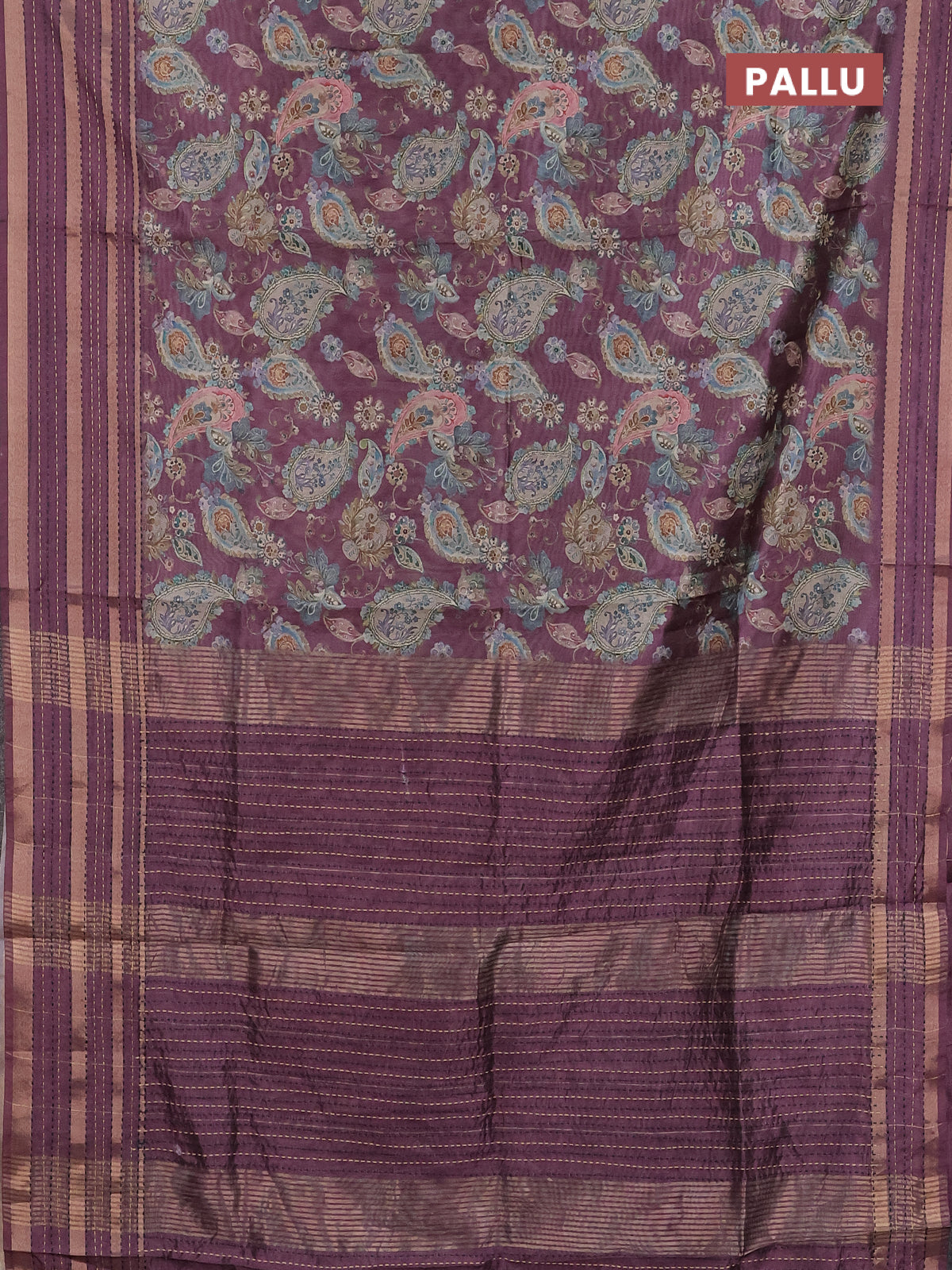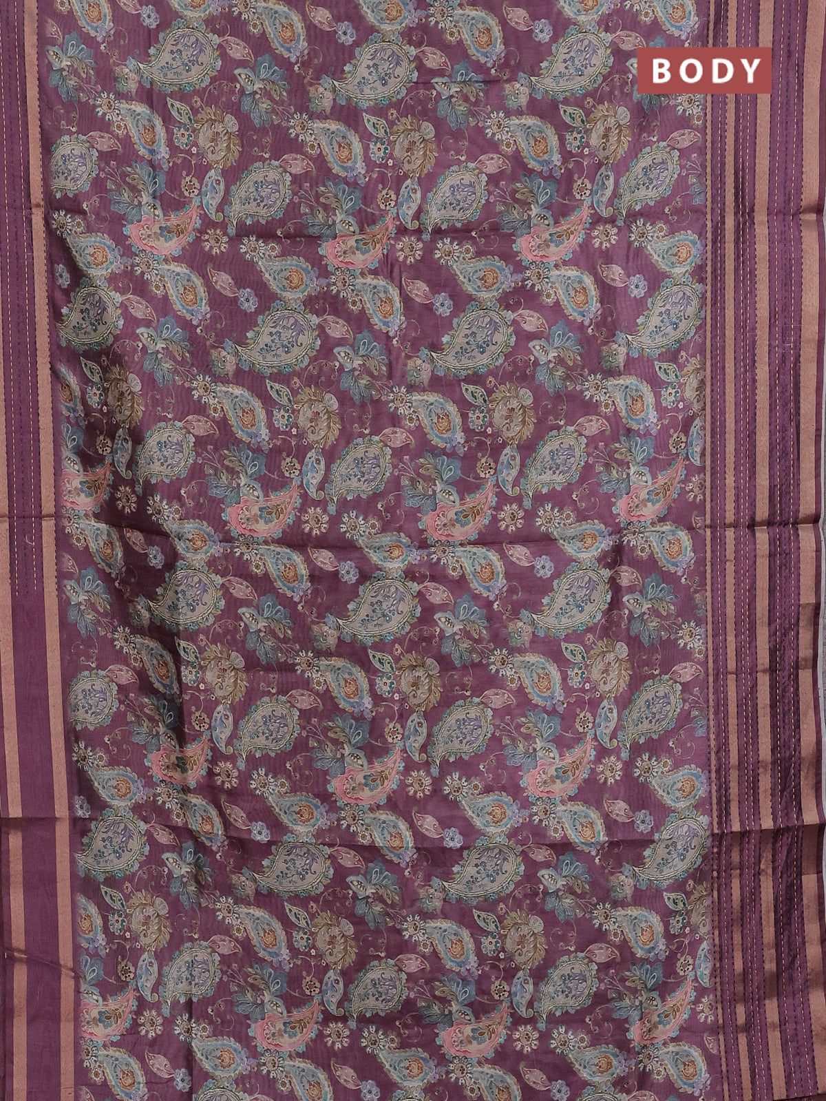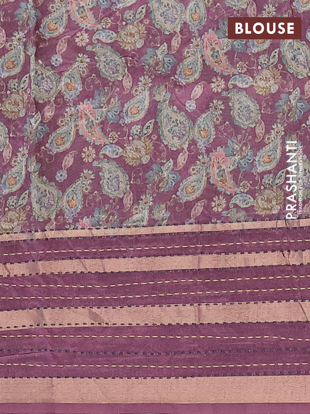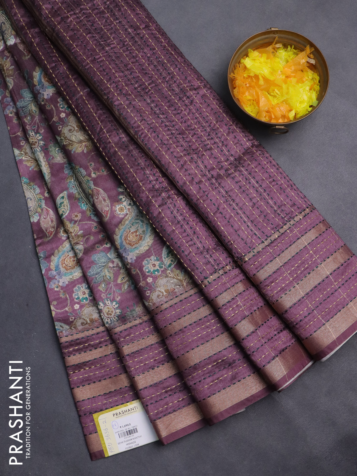 Semi tussar saree wine shade with allover prints and kantha stitch work border