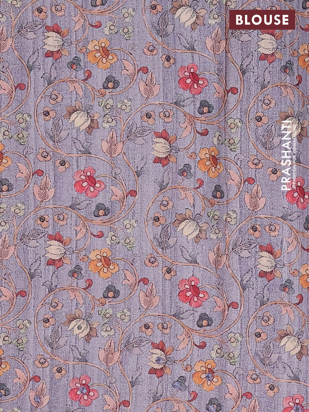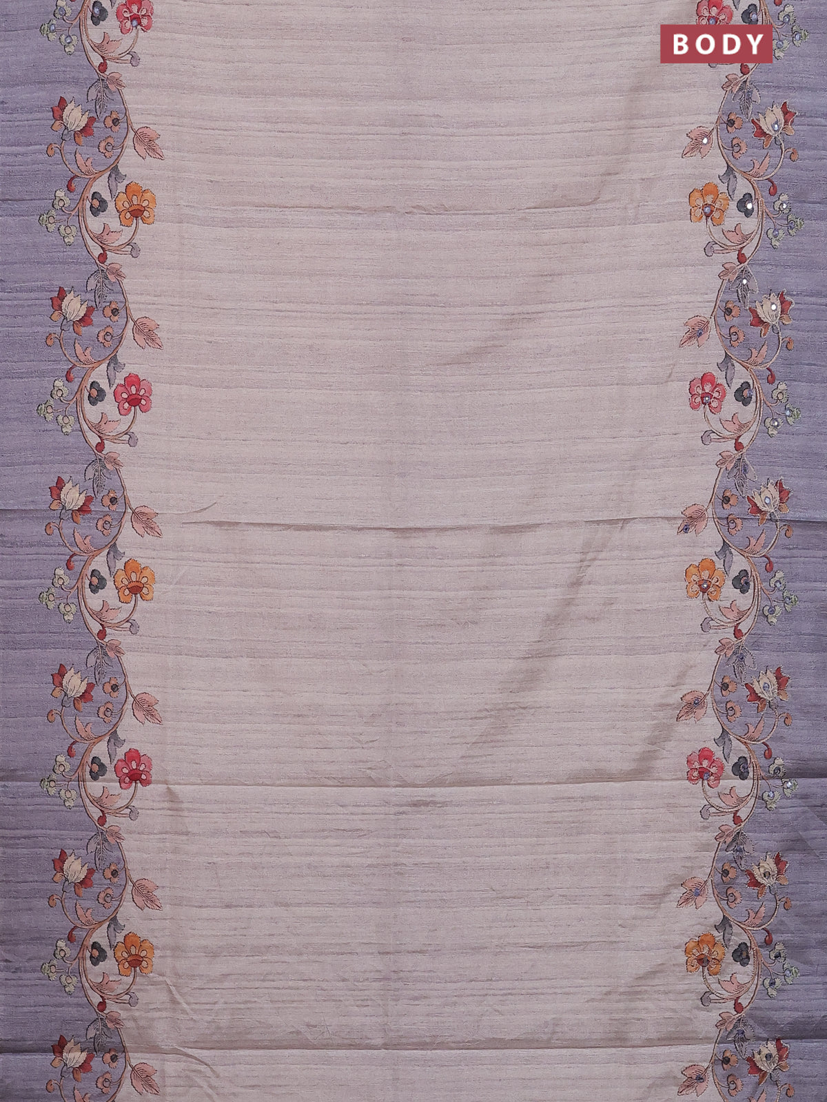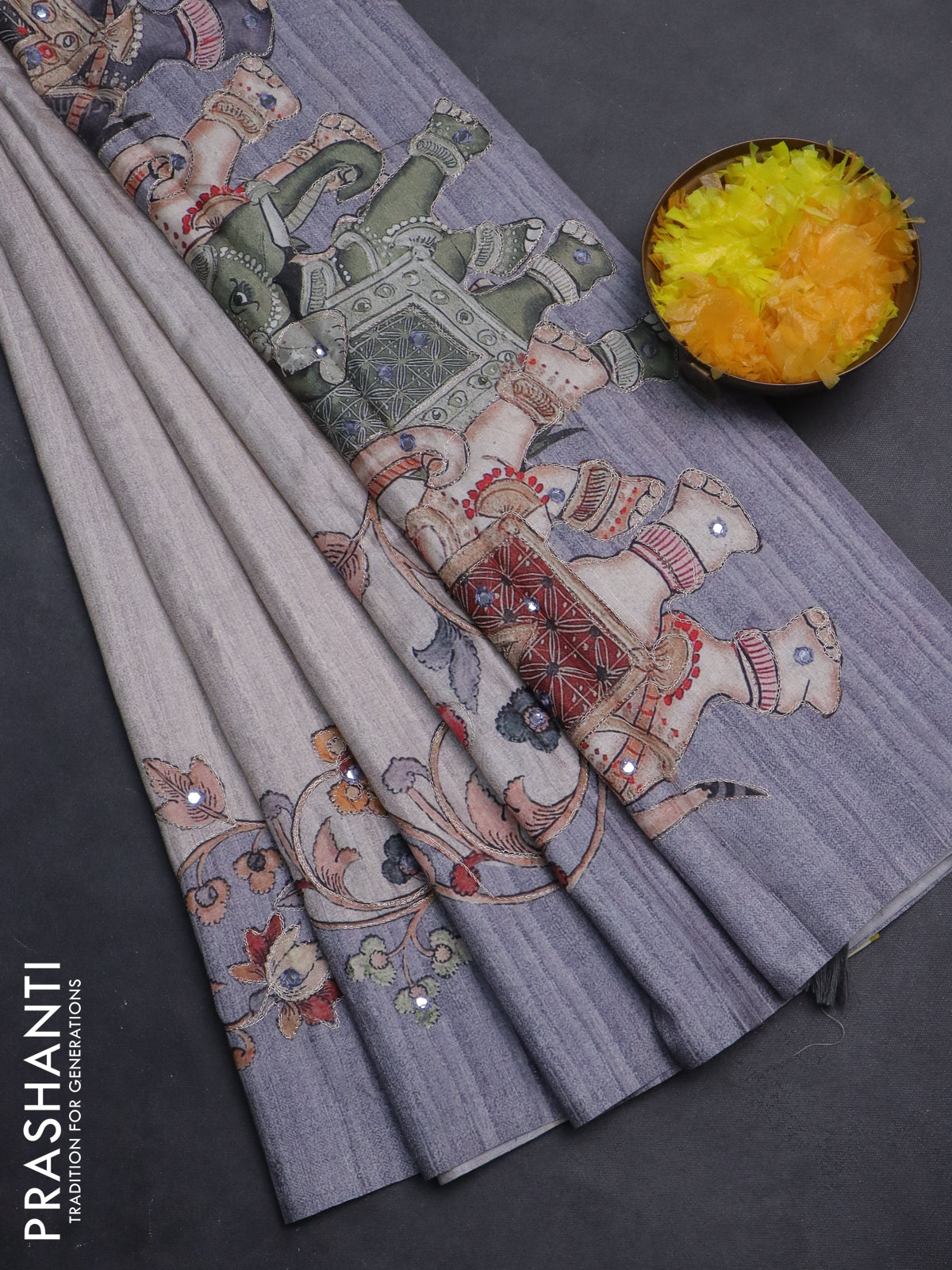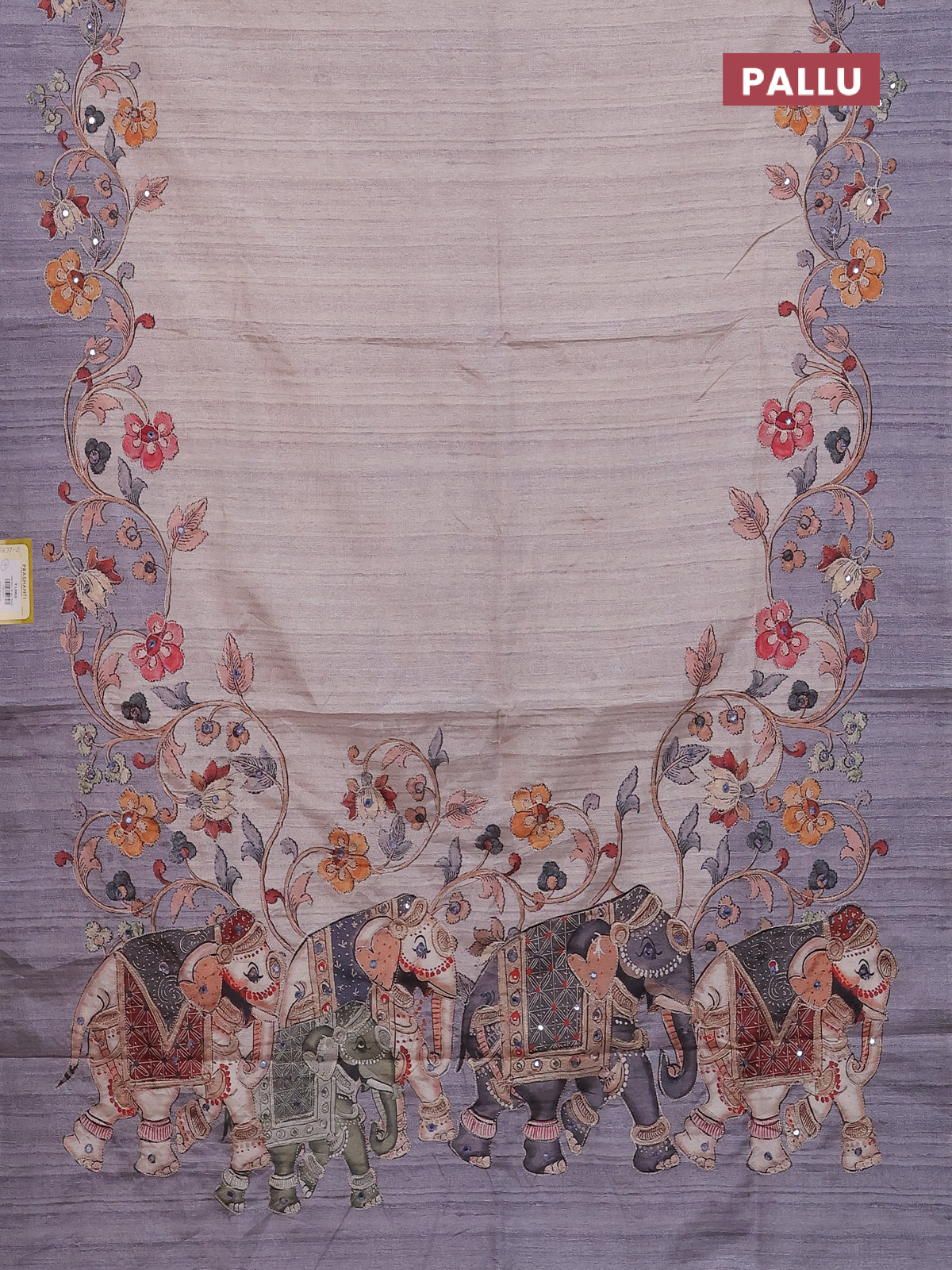 Semi tussar silk saree beige and grey with plain body and kalamkari prints & pita work