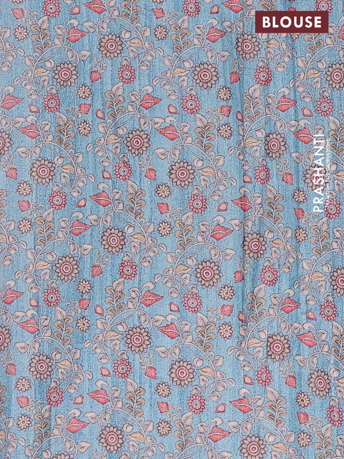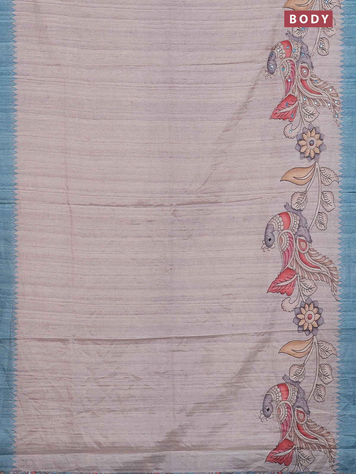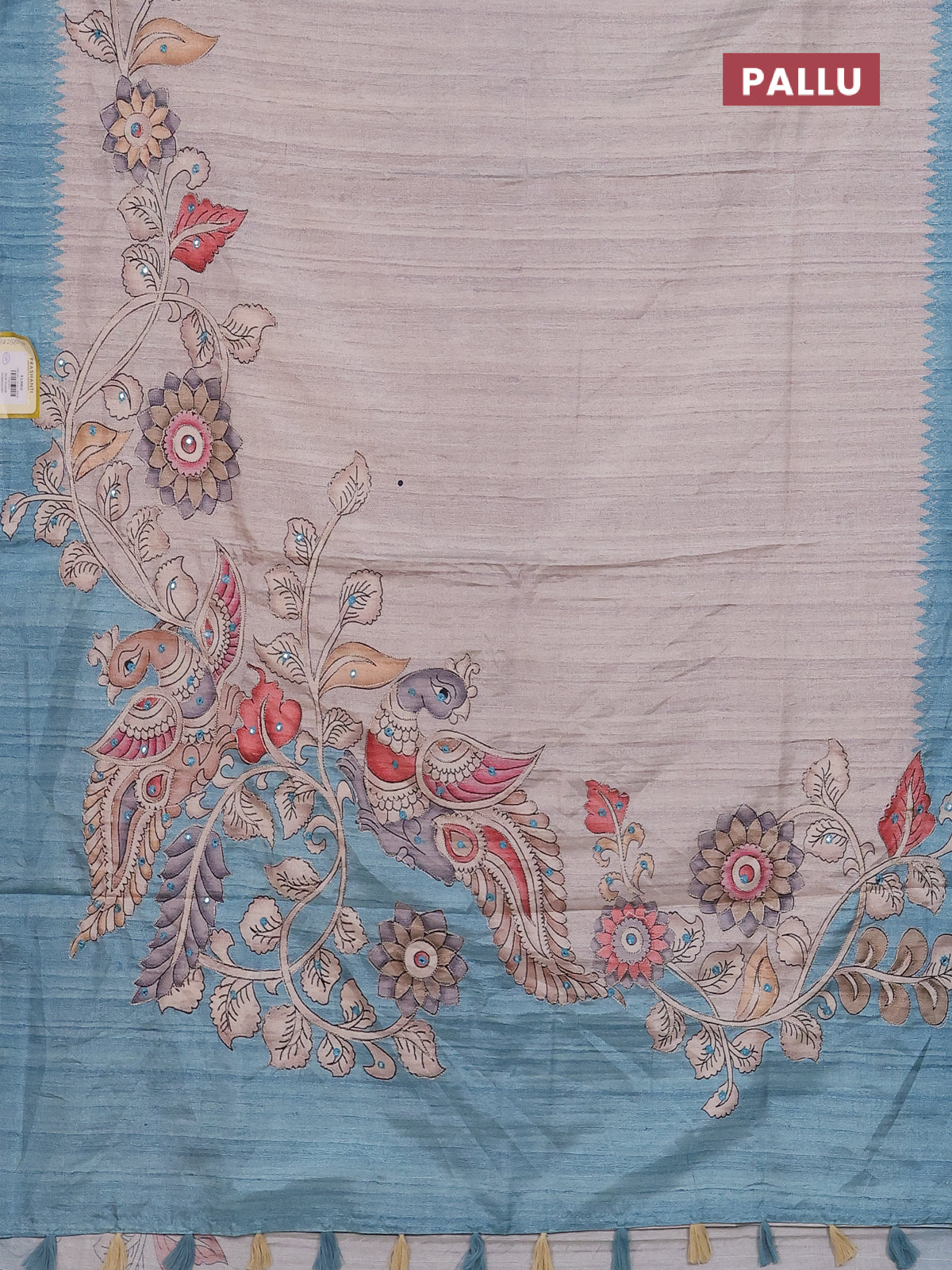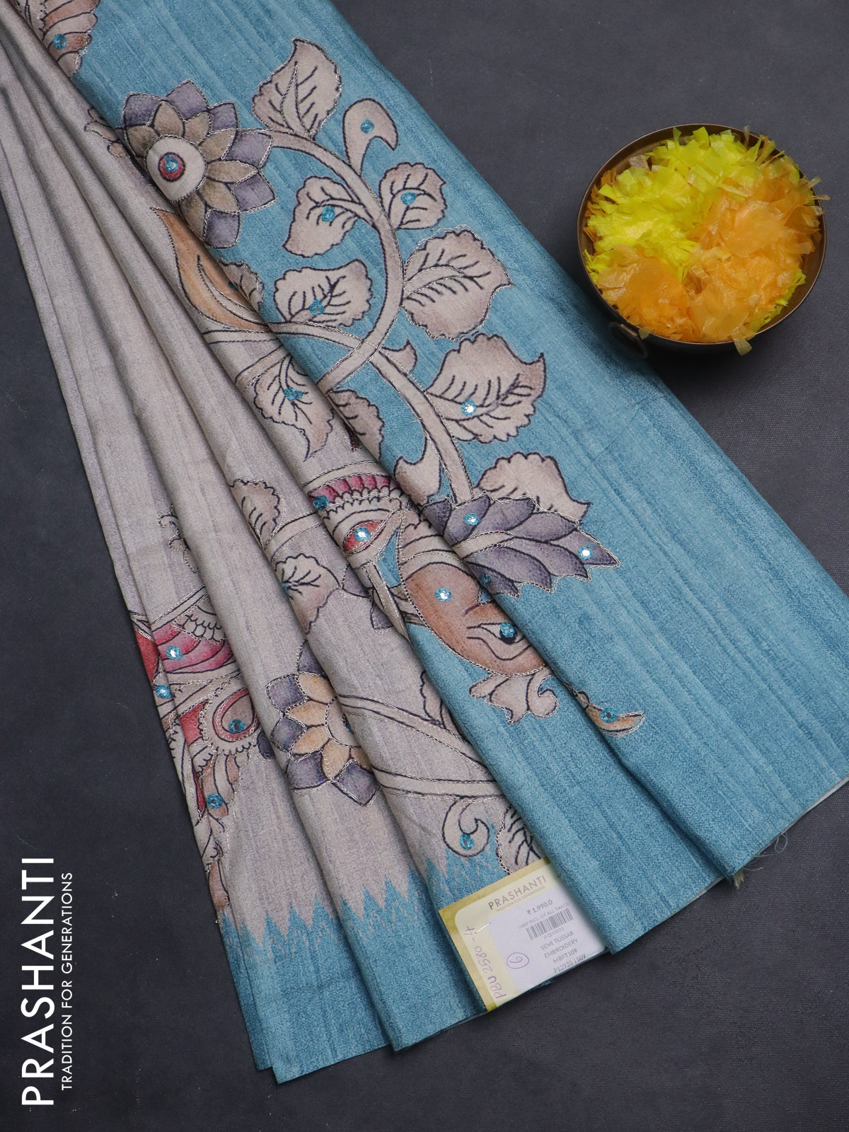 Semi tussar silk saree grey shade and light blue with plain body and kalamkari prints & pita work