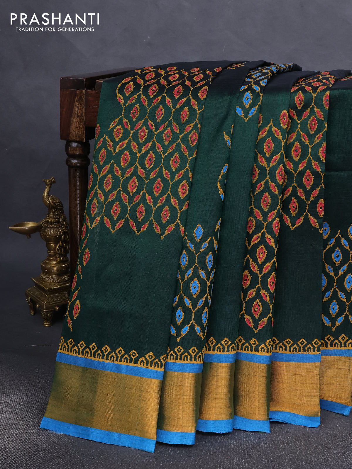 Silk cotton block printed saree bottle green and cs blue with butta prints and zari woven border