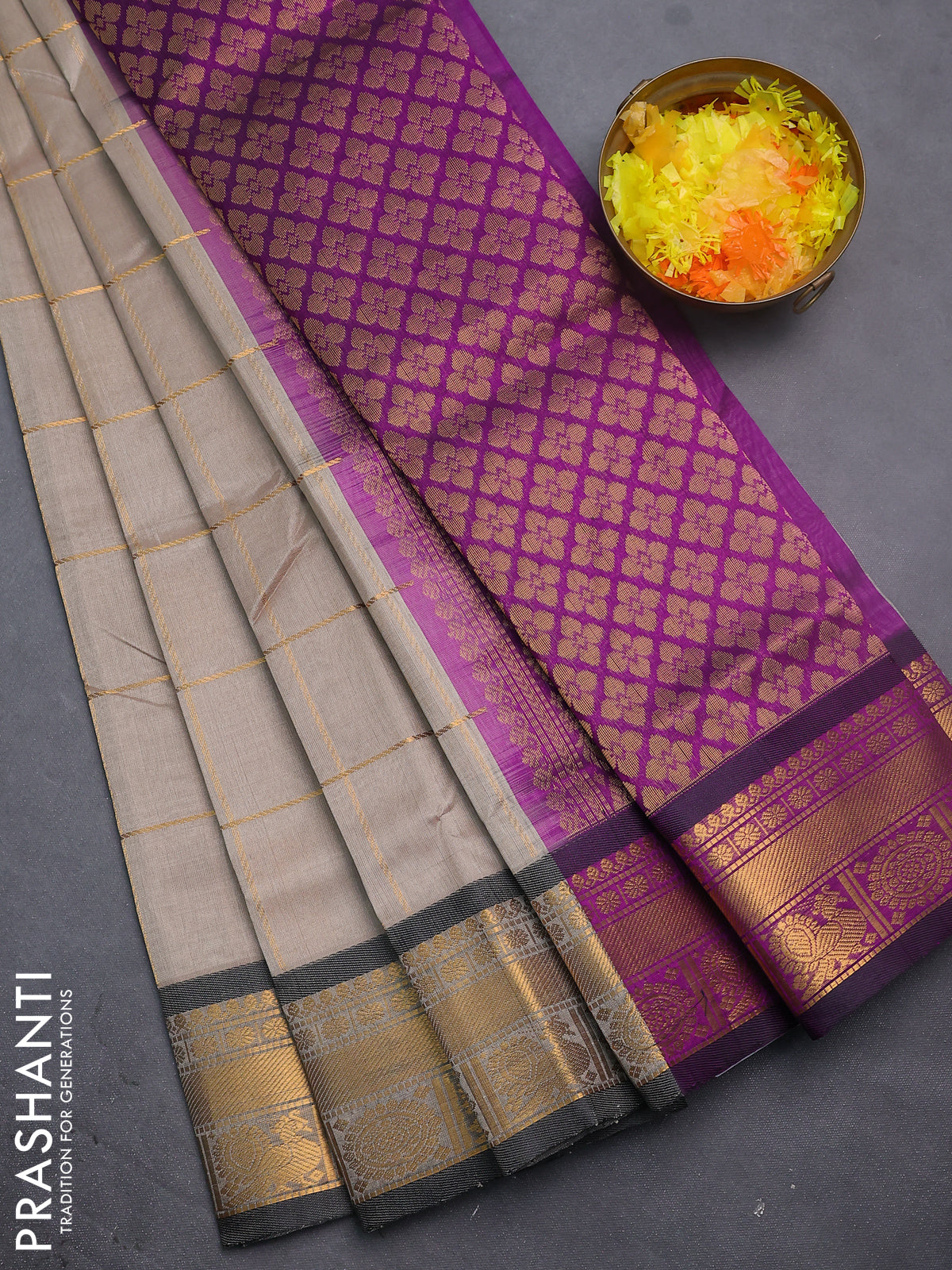 Silk cotton saree beige and purple with allover zari checks & buttas and zari woven border