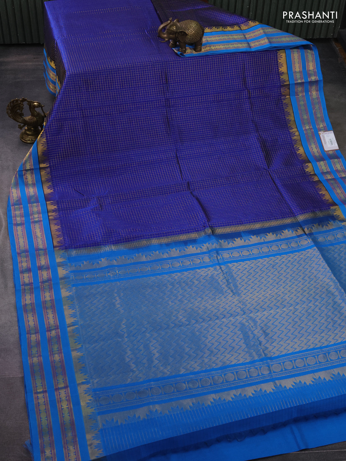 Silk cotton saree blue and cs blue with allover small zari checked pattern and temple design zari woven korvai border