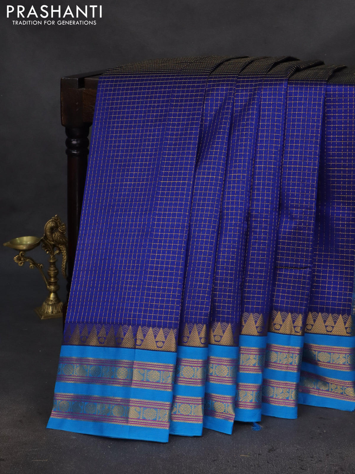 Silk cotton saree blue and cs blue with allover small zari checked pattern and temple design zari woven korvai border