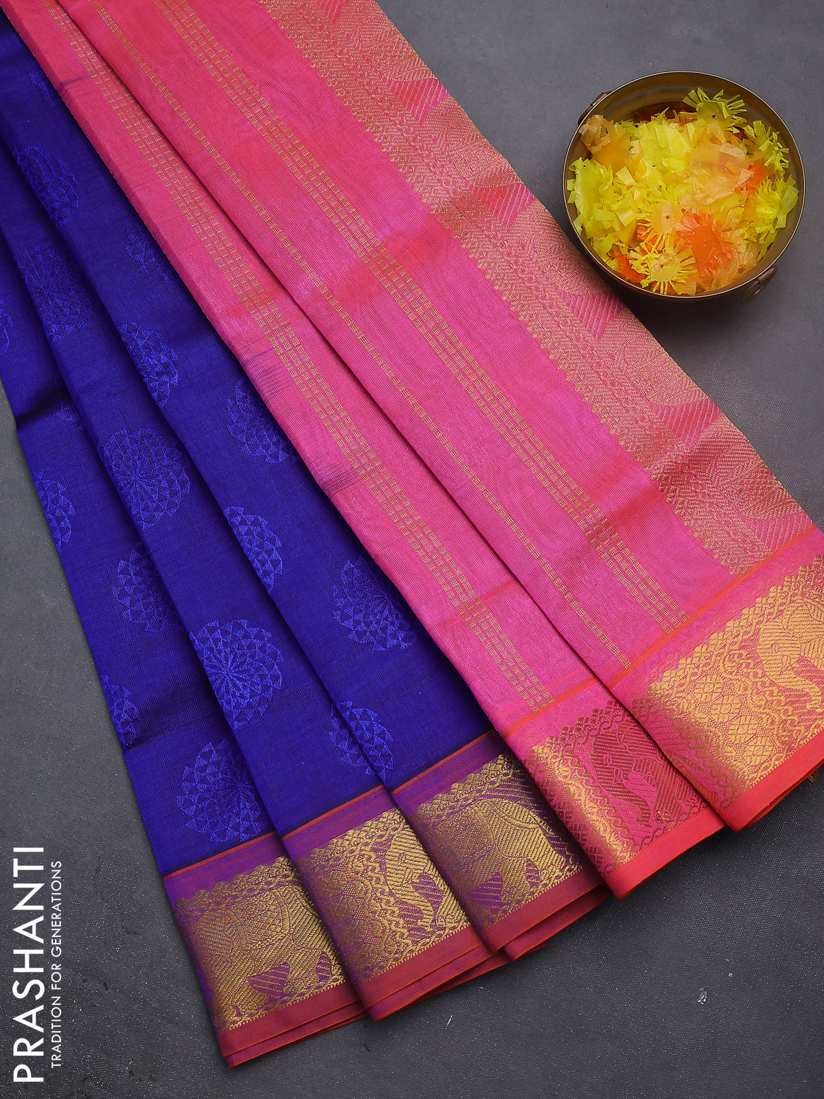 Silk cotton saree blue and dual shade of pinkish orange with allover self emboss jacquard and elephant zari woven border