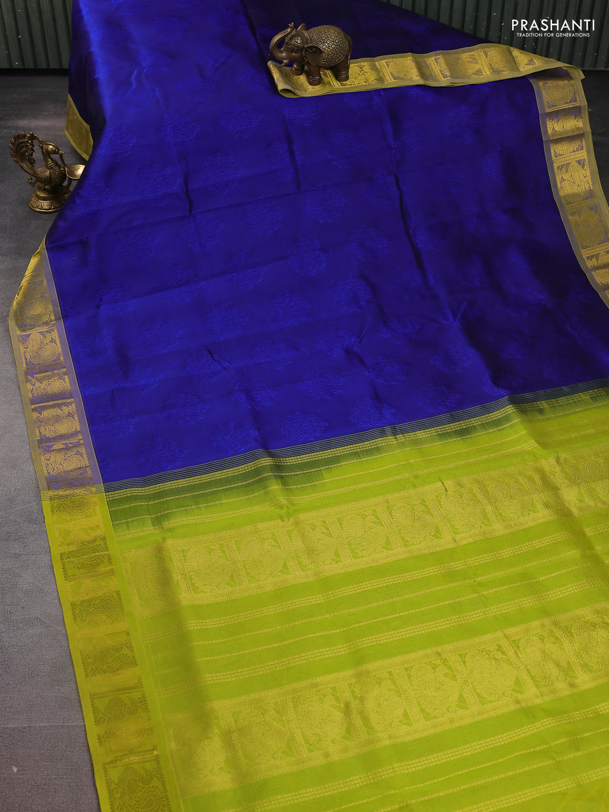 Silk cotton saree blue and fluorescent green with allover self emboss jacquard and zari woven border