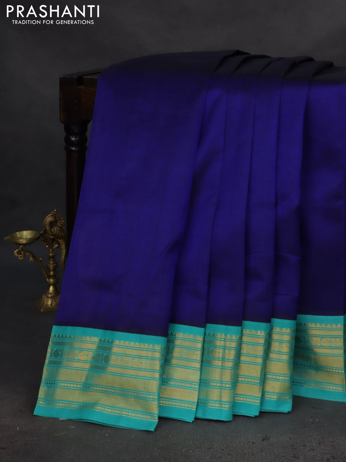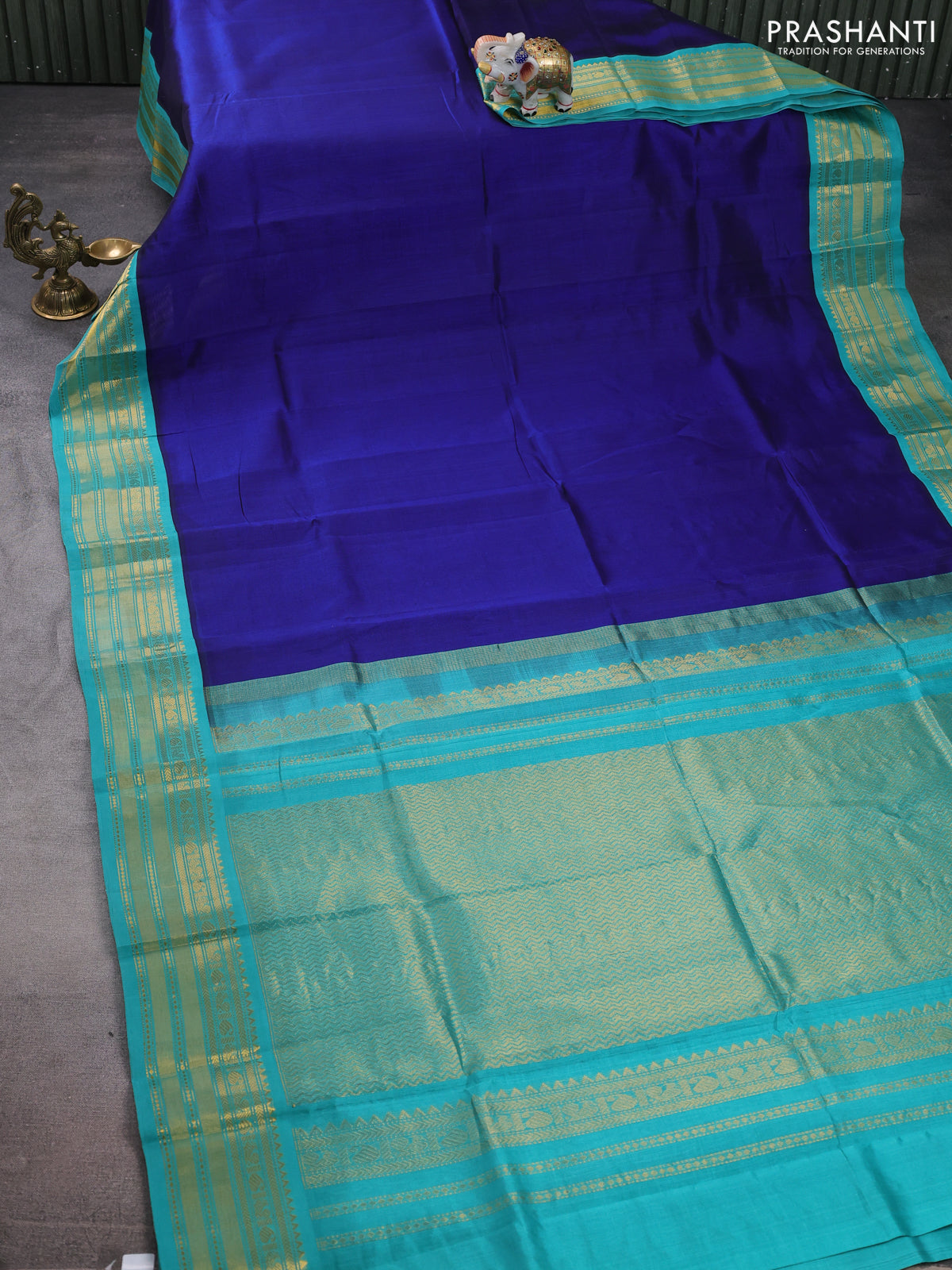 Silk cotton saree blue and teal blue with plain body and zari woven korvai border