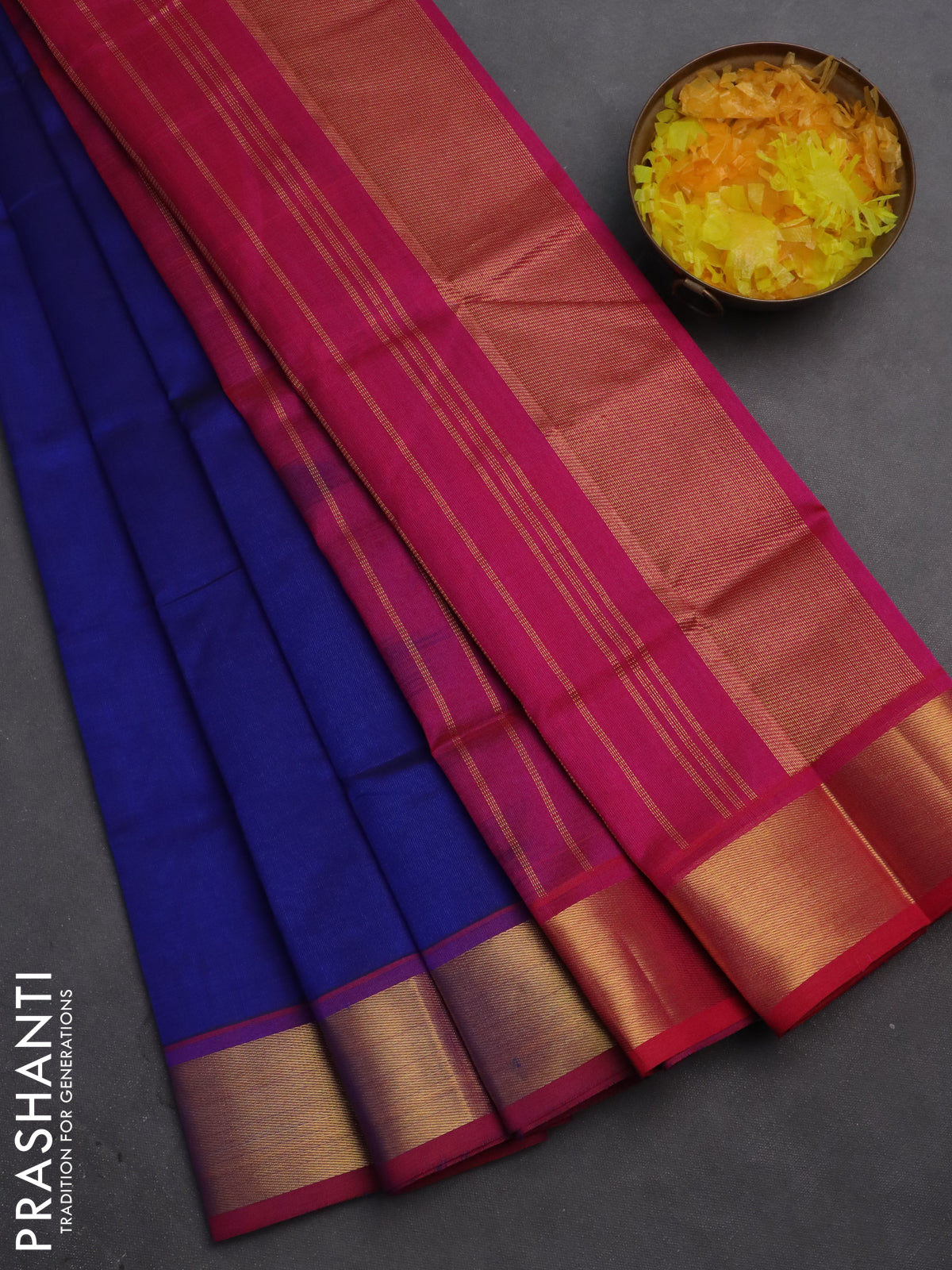 Silk cotton saree dark blue and magenta pink with plain body and zari woven border