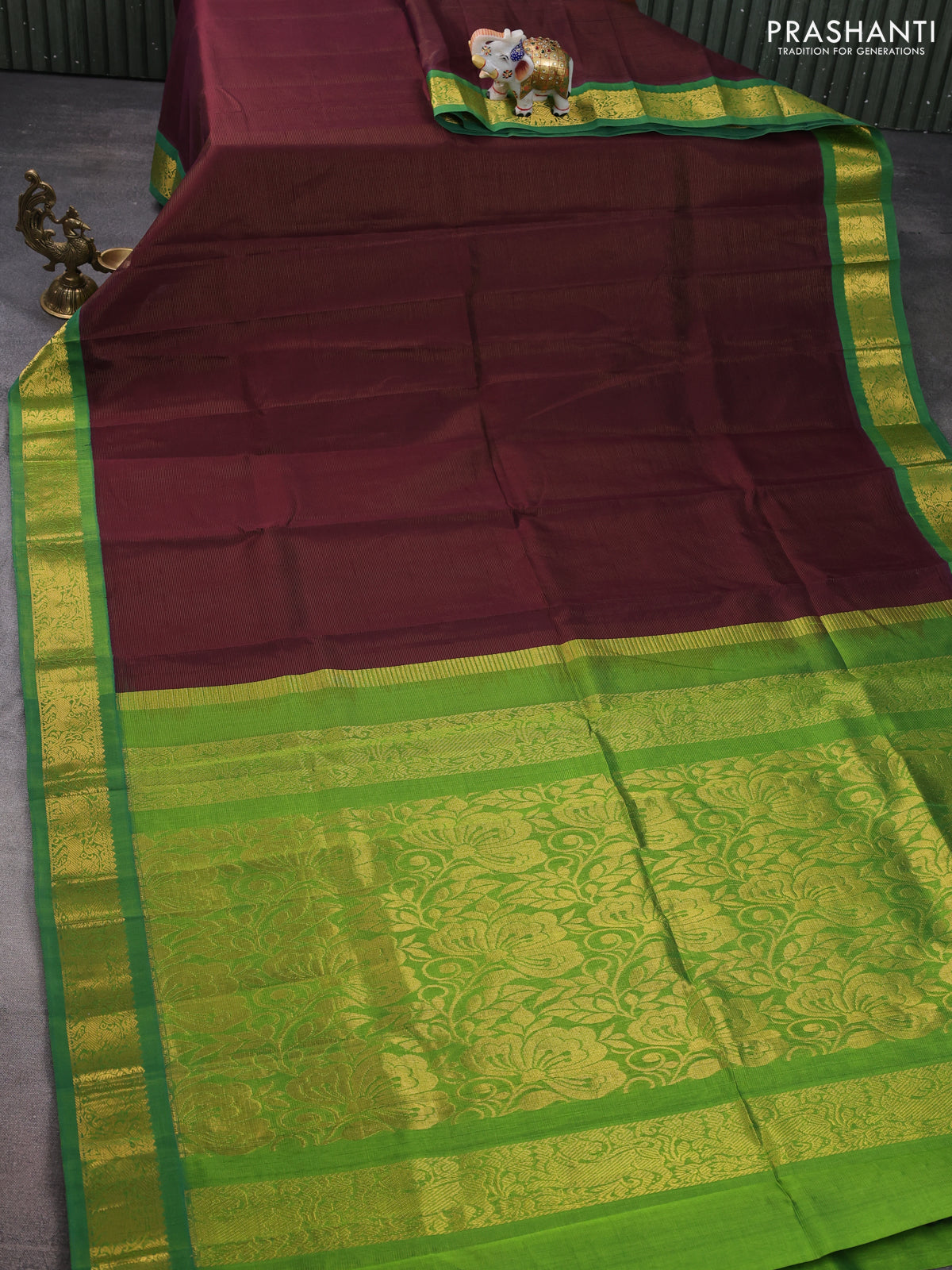 Silk cotton saree deep maroon and green with allover vairaosi pattern and zari woven korvai border