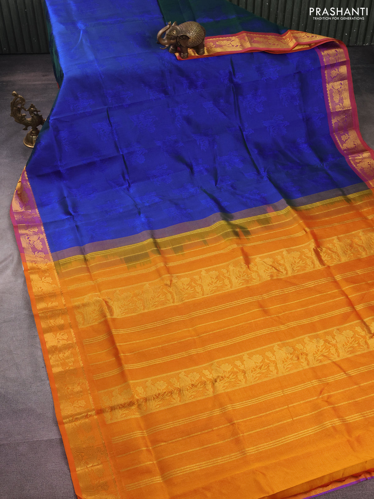 Silk cotton saree dual shade of blue and orange with allover self emboss jacquard and peacock zari woven border