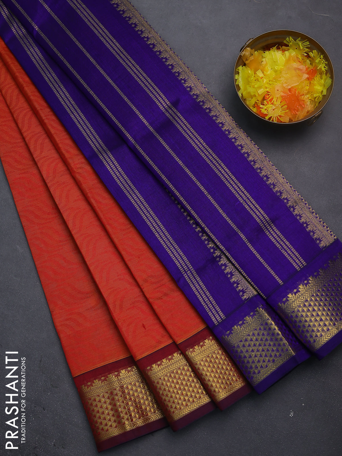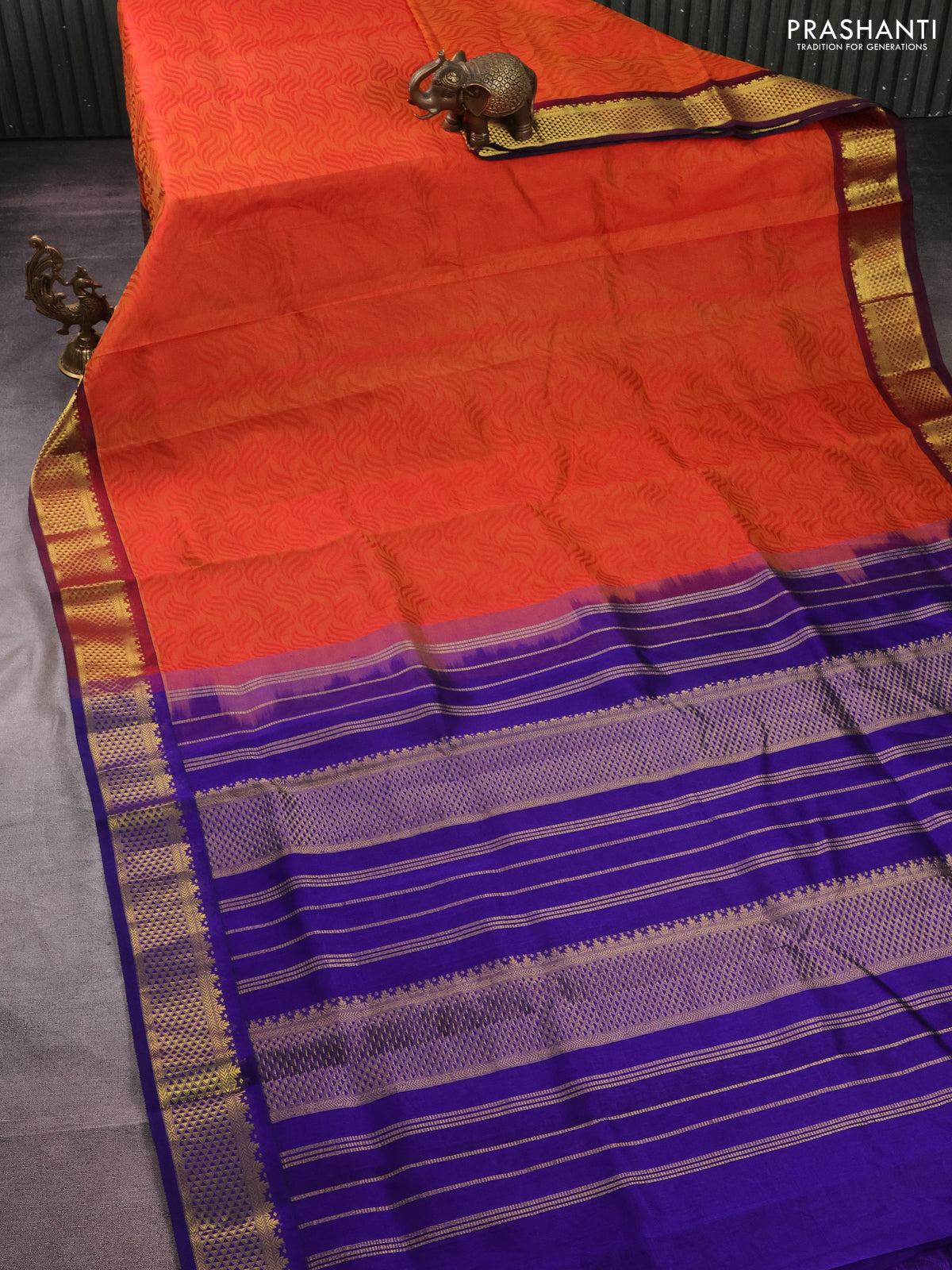 Silk cotton saree dual shade of orange and blue with allover self emboss jacquard and zari woven border