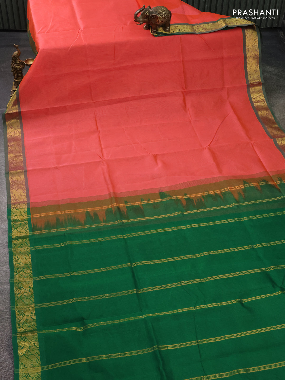Silk cotton saree dual shade of peach pink and green with plain body and zari woven border