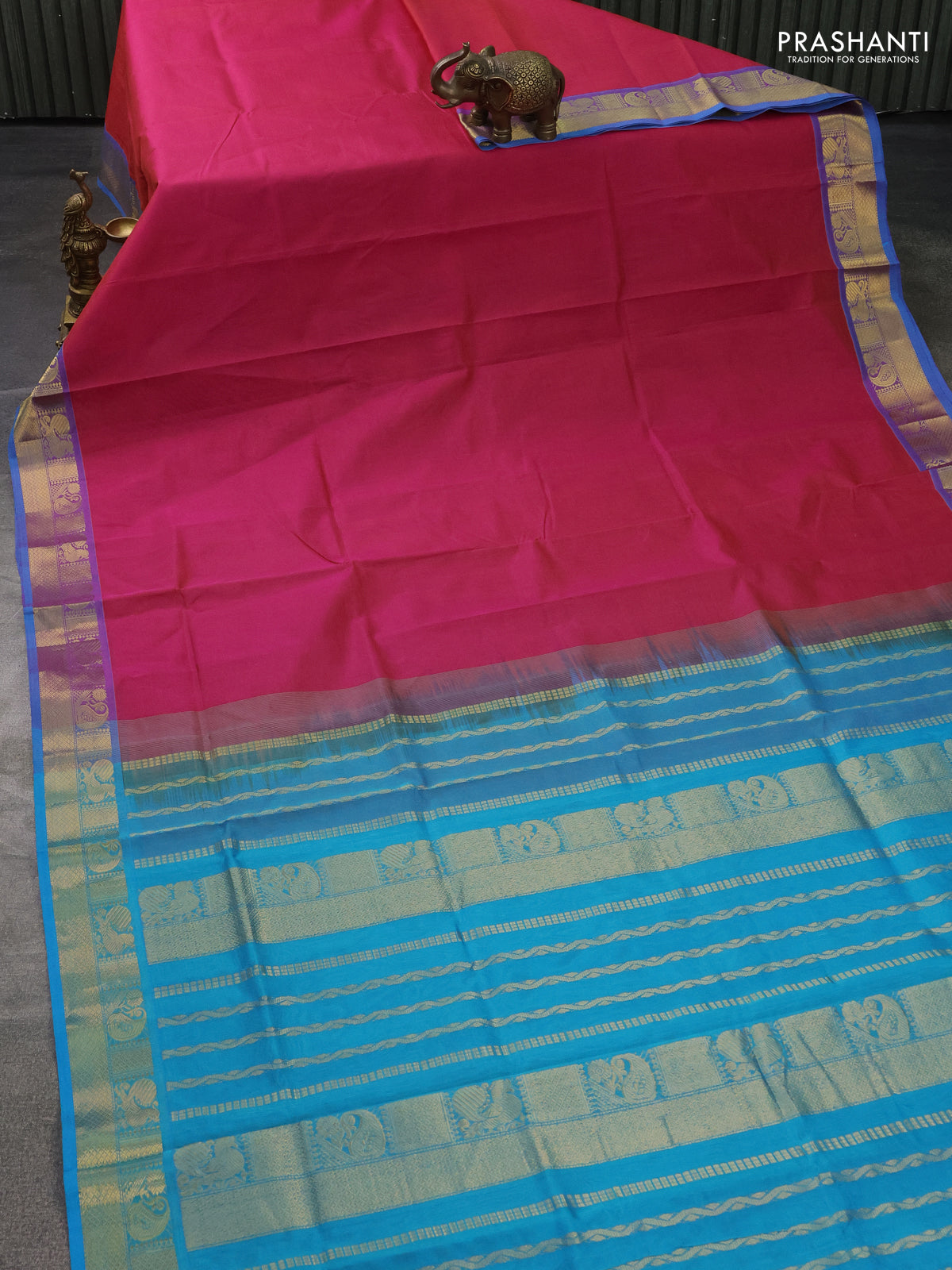 Silk cotton saree dual shade of pink and cs blue with plain body and zari woven border