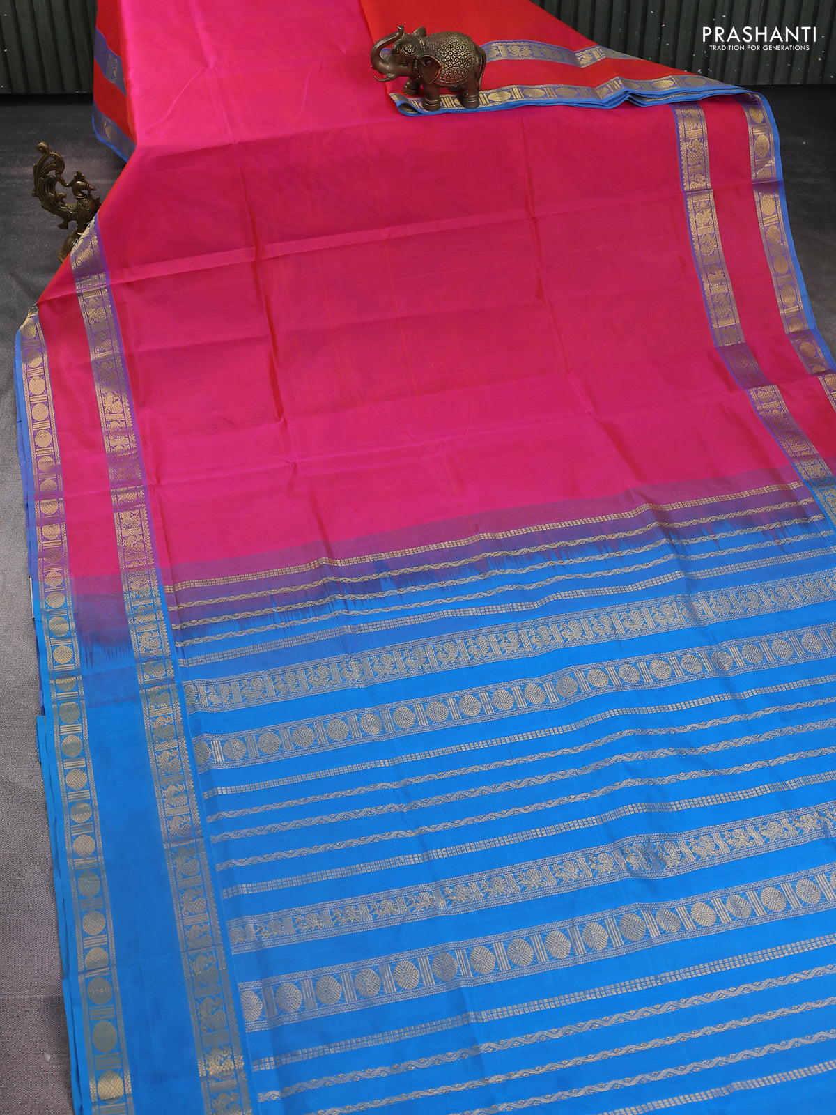 Silk Cotton saree dual shade of pinkish orange and cs blue with plain body and rettapet zari woven border