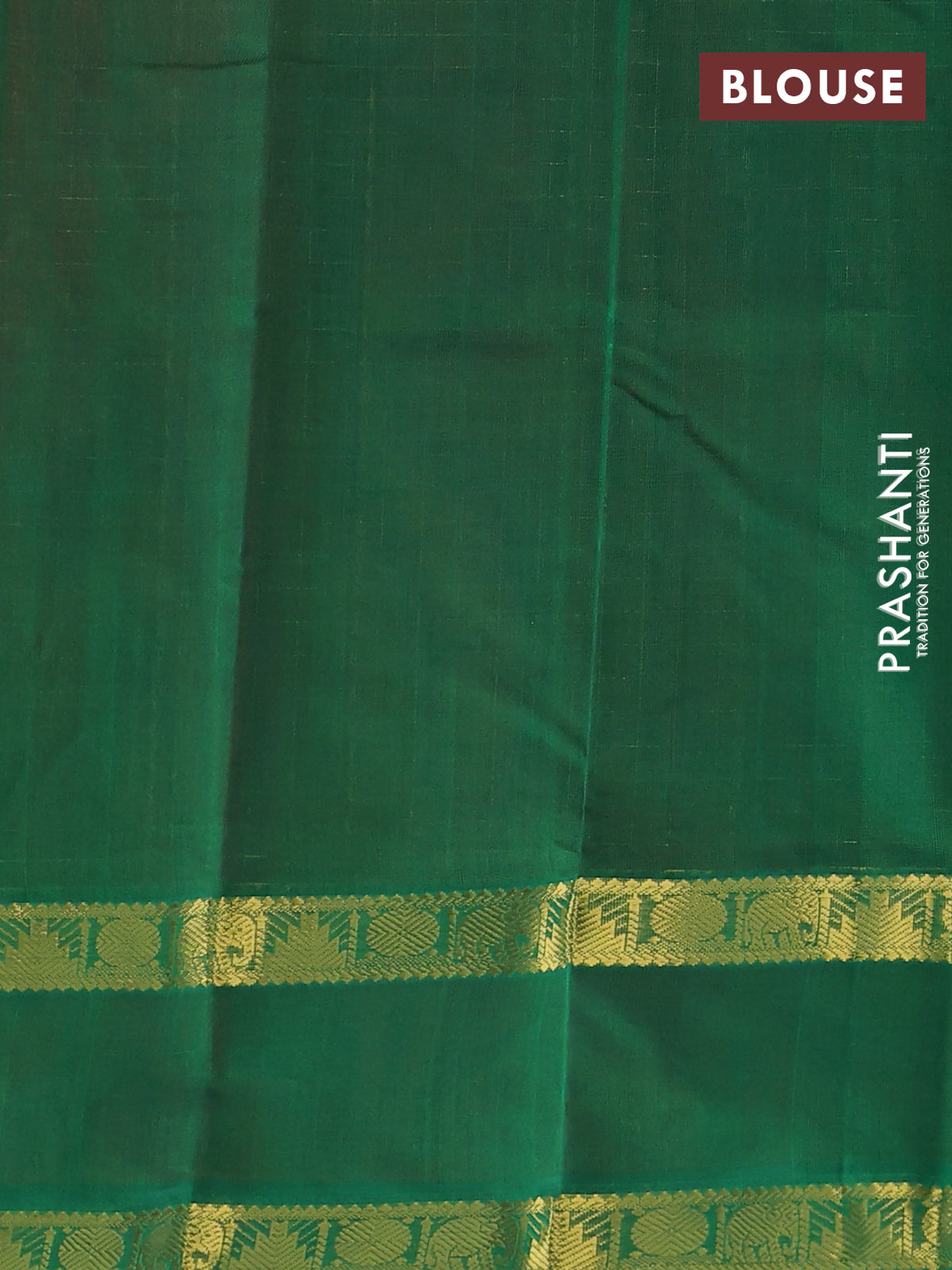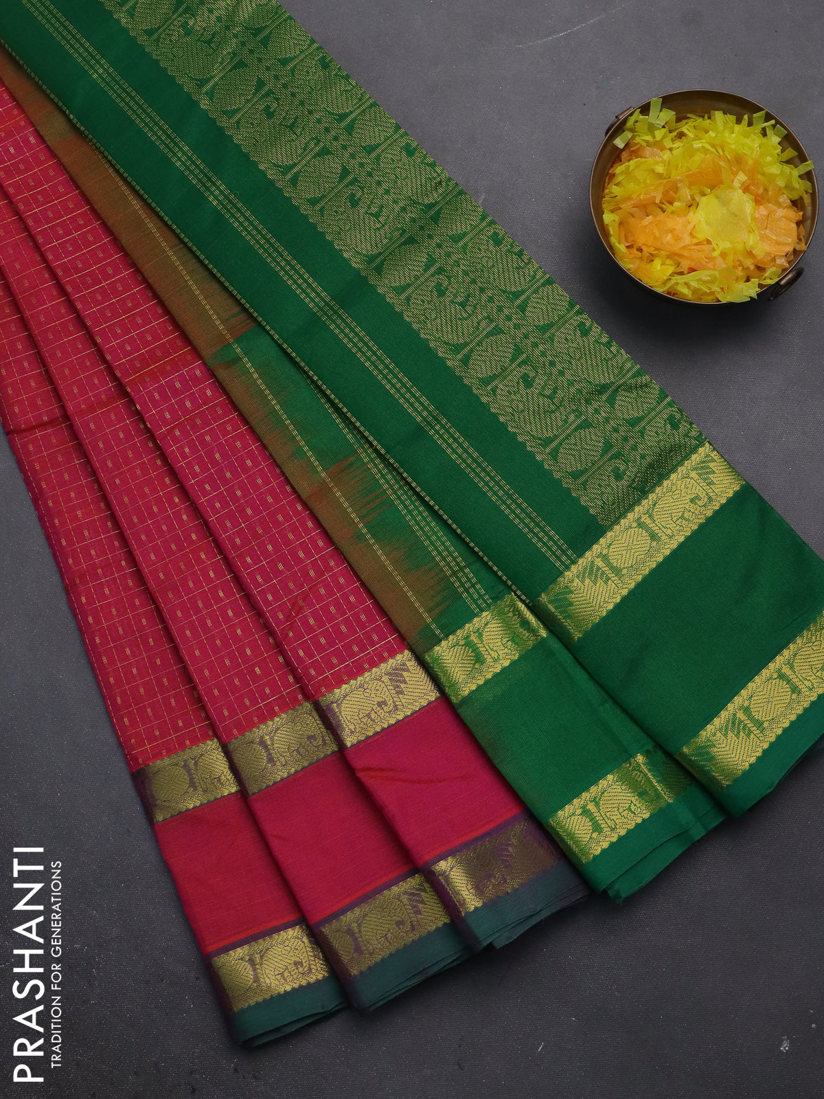Silk cotton saree dual shade of pinkish orange and green with allover zari checks & lakshadeepam weaves and rettapet zari woven border