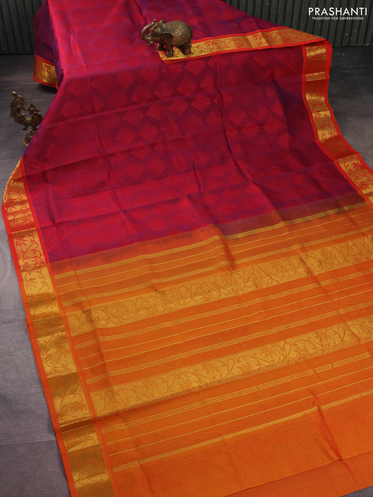 Silk cotton saree dual shade of reddish purple and orange with allover self emboss jacquard and zari woven border