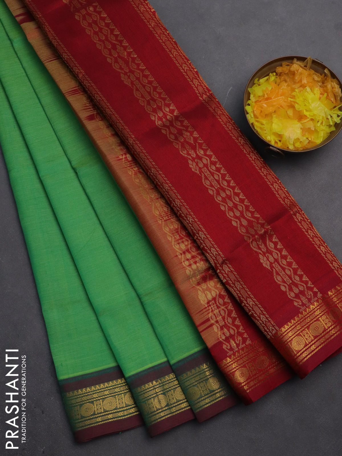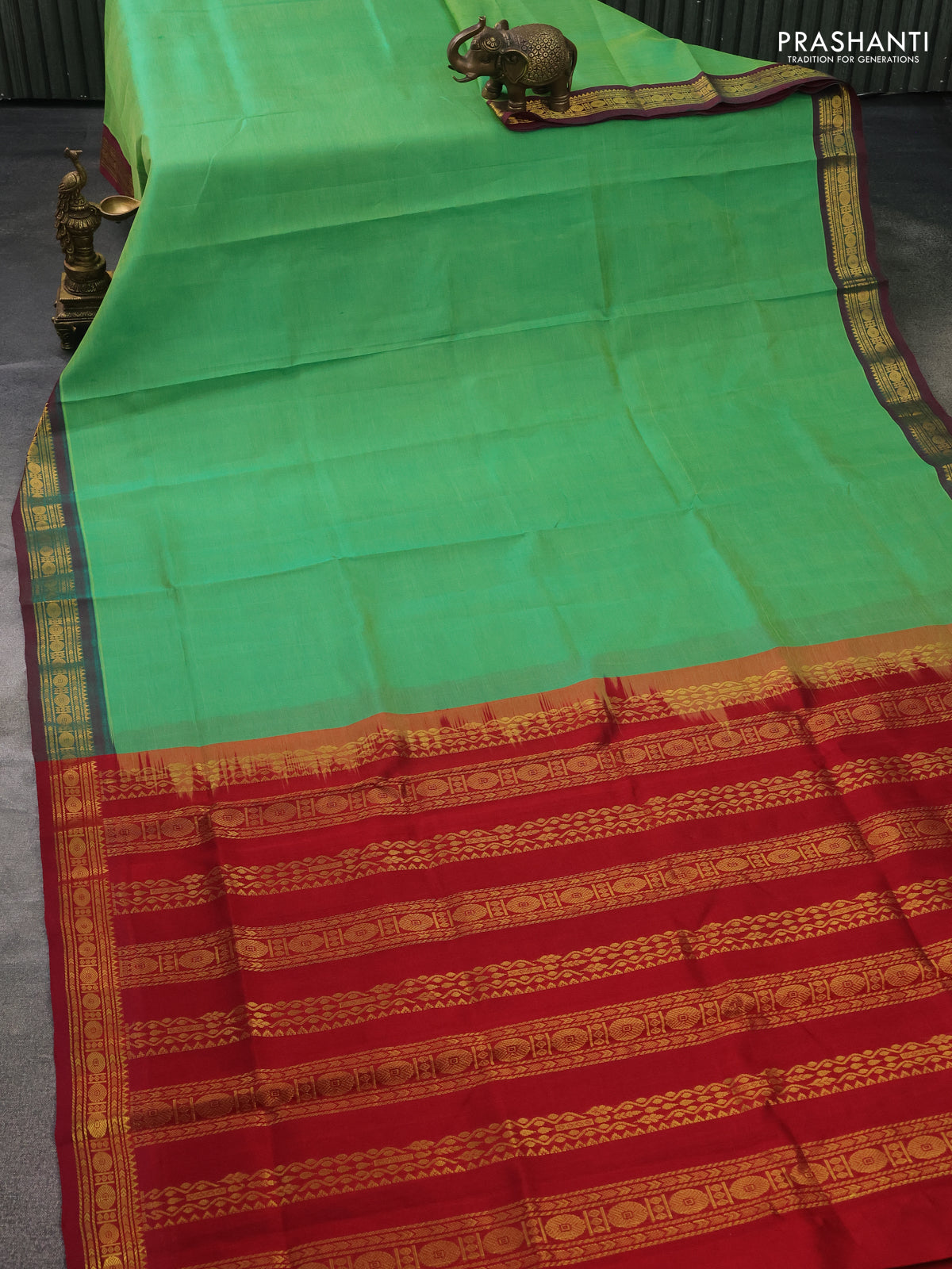 Silk cotton saree green and maroon with plain body and zari woven border