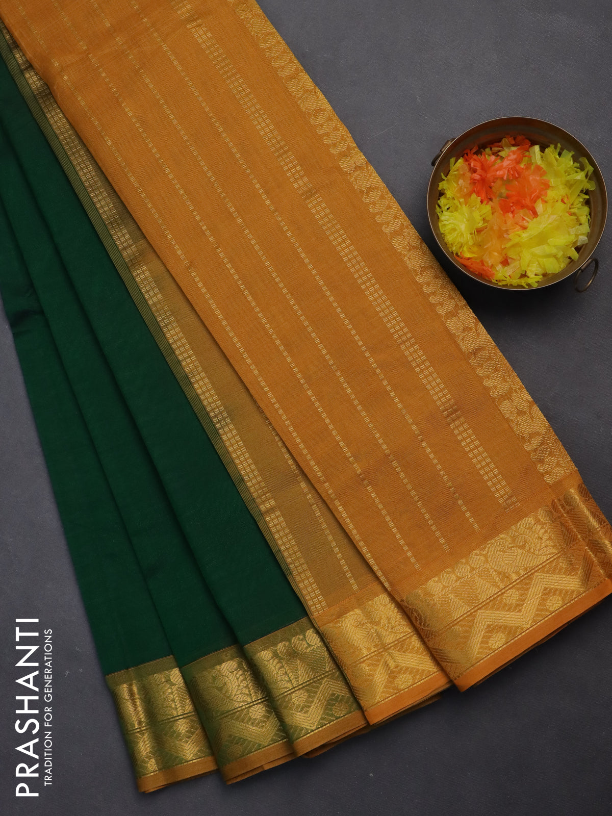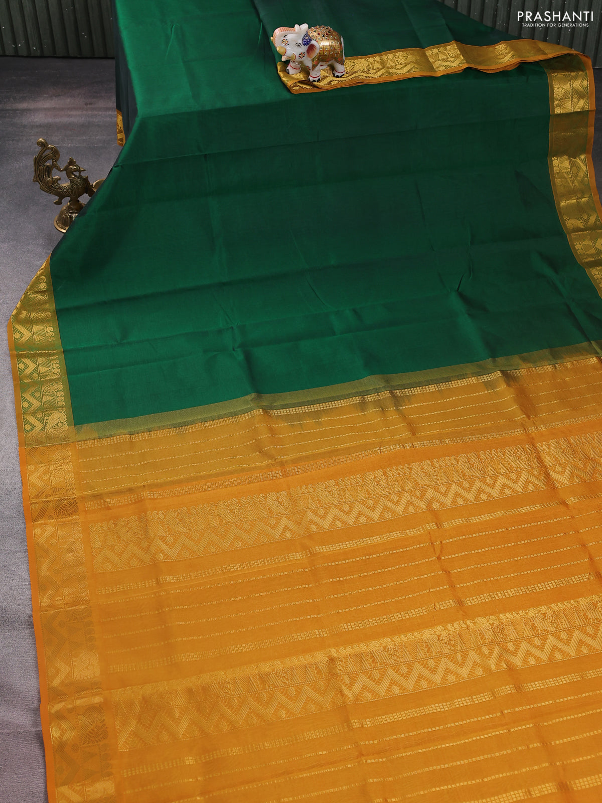 Silk cotton saree green and mustard yellow with plain body and zari woven border