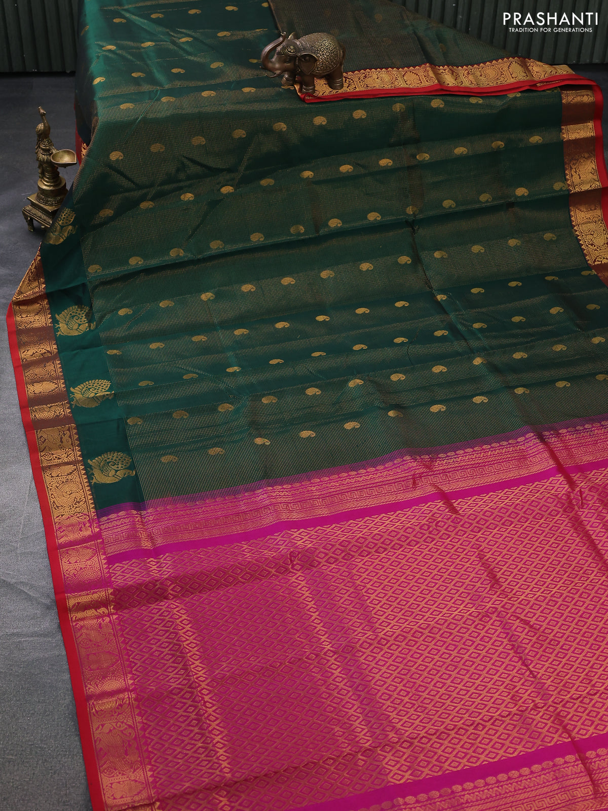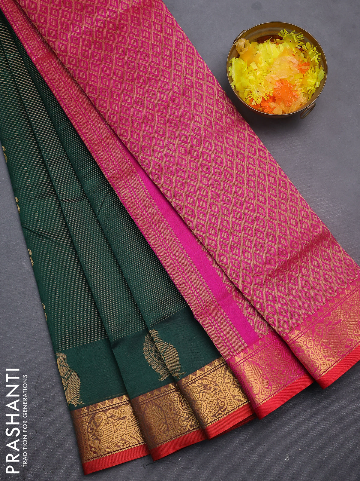 Silk cotton saree green and pink with allover vairosi weaves & buttas and rich zari woven border