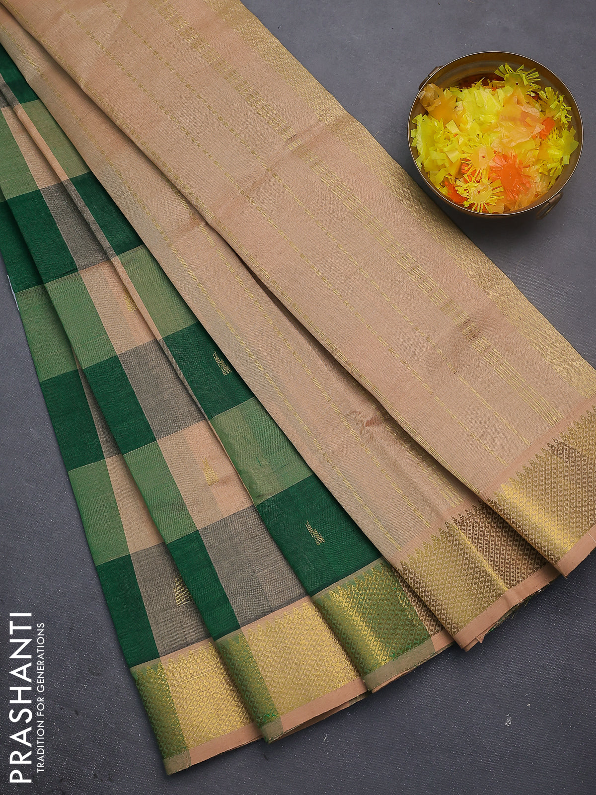 Silk cotton saree green and sandal with allover paalum pazhamun checks & zari buttas and zari woven border