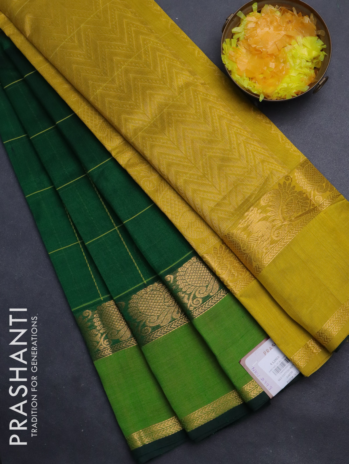 Silk cotton saree green and yellow with checked pattern & buttas and rettapet zari woven border