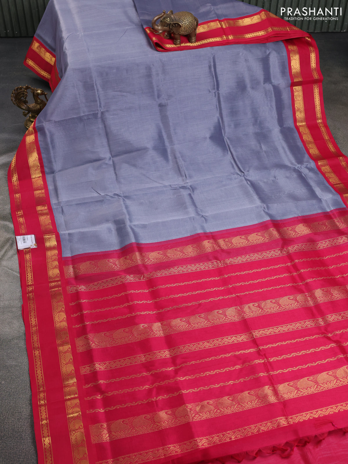 Silk cotton saree grey and reddish pink with plain body and rettapet zari woven korvai border